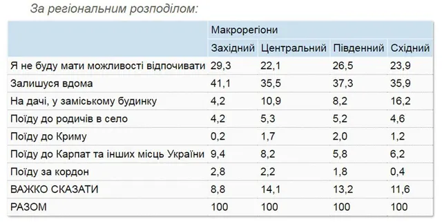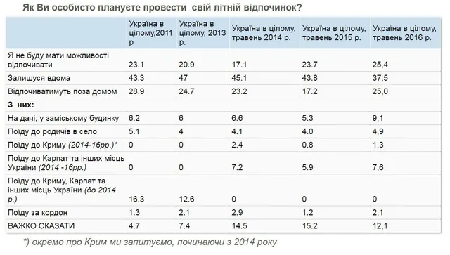 К родственникам в село планируют ехать 5% опрошенных. Количество тех, кто планирует поехать отдыхать за границу составляет 2%. В Крым, как и год назад, планирует ехать 1% опрошенных украинцев. Не определились с отпуском 12% опрошенных.