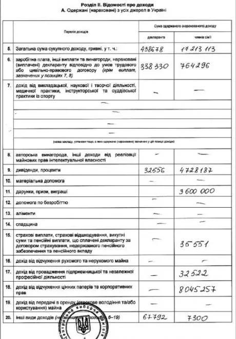 Зато члены его семьи заработали за тот же период 17,2 миллиона гривен.