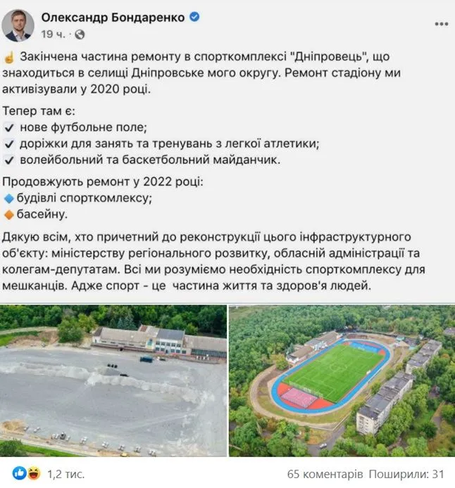 "Бывший глава Днепровской ОГА с гордостью сообщает о ремонте спорткомплекса "Днепровец", как будто это его заслуга. На самом деле, до 2021 года, пока этот господин был на своем посту, было выполнено около 1% работ (на первом фото видно состояние объекта весной 2021 года). Через полгода после его увольнения – 99%", – написал Казанский.
