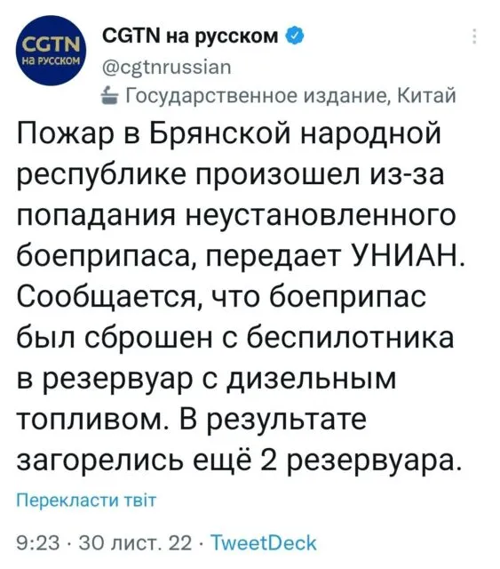 Китайский государственный канал CGTN на своей странице в твиттере назвал Брянскую область России "Брянской народной республикой".