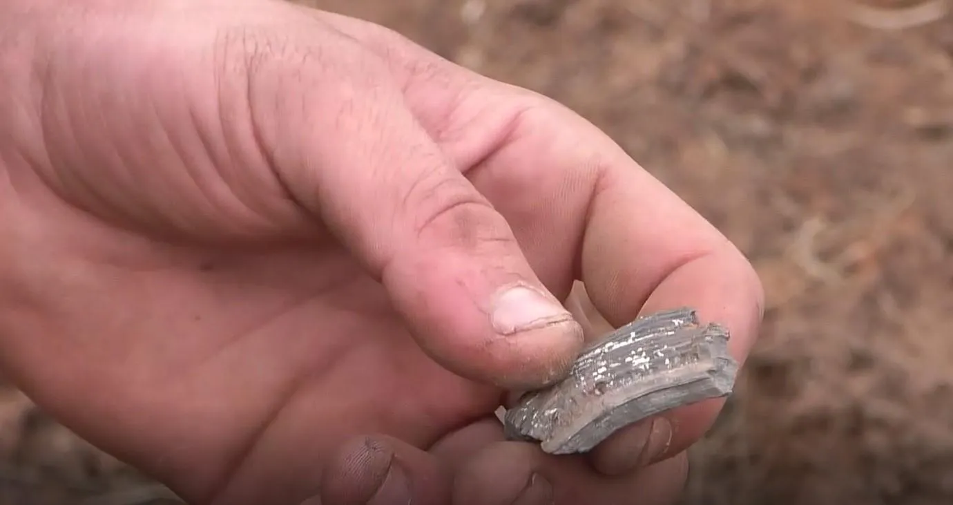 Военнослужащий Николай показывает обломки от вражеских мин, найденных военными в воронках. От таких, говорит, бронежилет не защитит.
