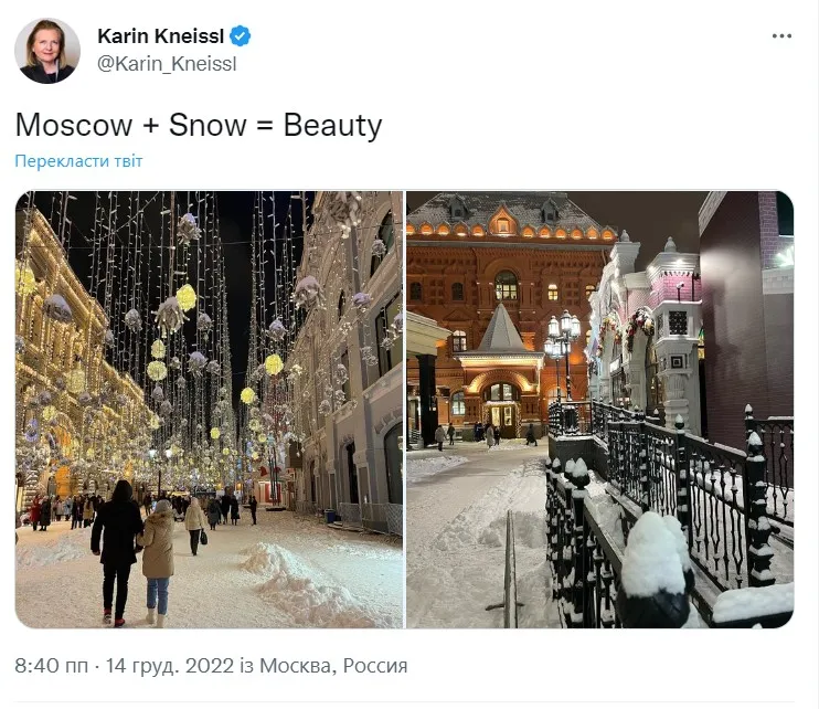 Словесный спор произошел в твиттере. Бывшая глава министерства иностранных дел Австрии Карин Кнайсль написала: "Москва+снег=красота" и опубликовала фото из российской столицы.