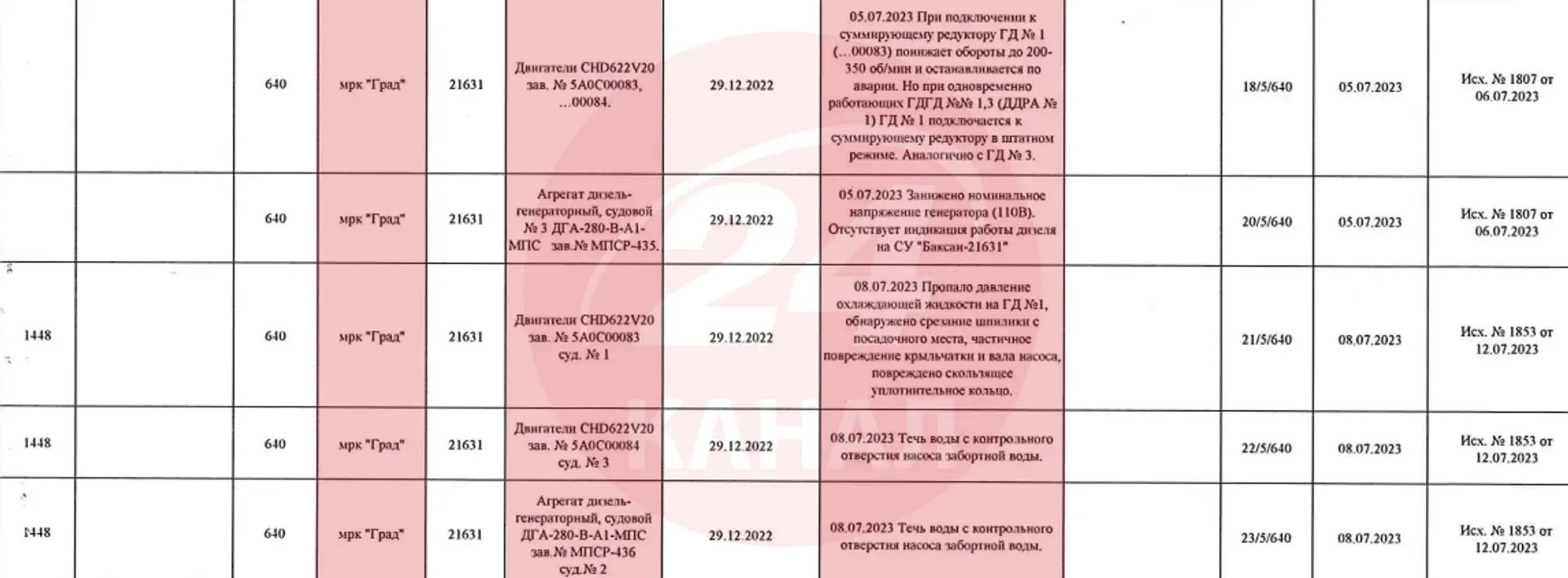 Известно, что в "Морские пропульсивные системы" с января по август 2023 года поступило аж 12 рекламаций относительно неисправностей этого судна. Среди основных проблем – нарушение работы редукторов у двигателей, уменьшение давления охлаждающей жидкости.