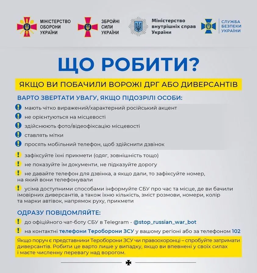Доступными способами сообщите в СБУ время и место, где видели диверсантов, их количество, содержание разговора, номера, цвет и марки автомобилей, направление движения, приметы.