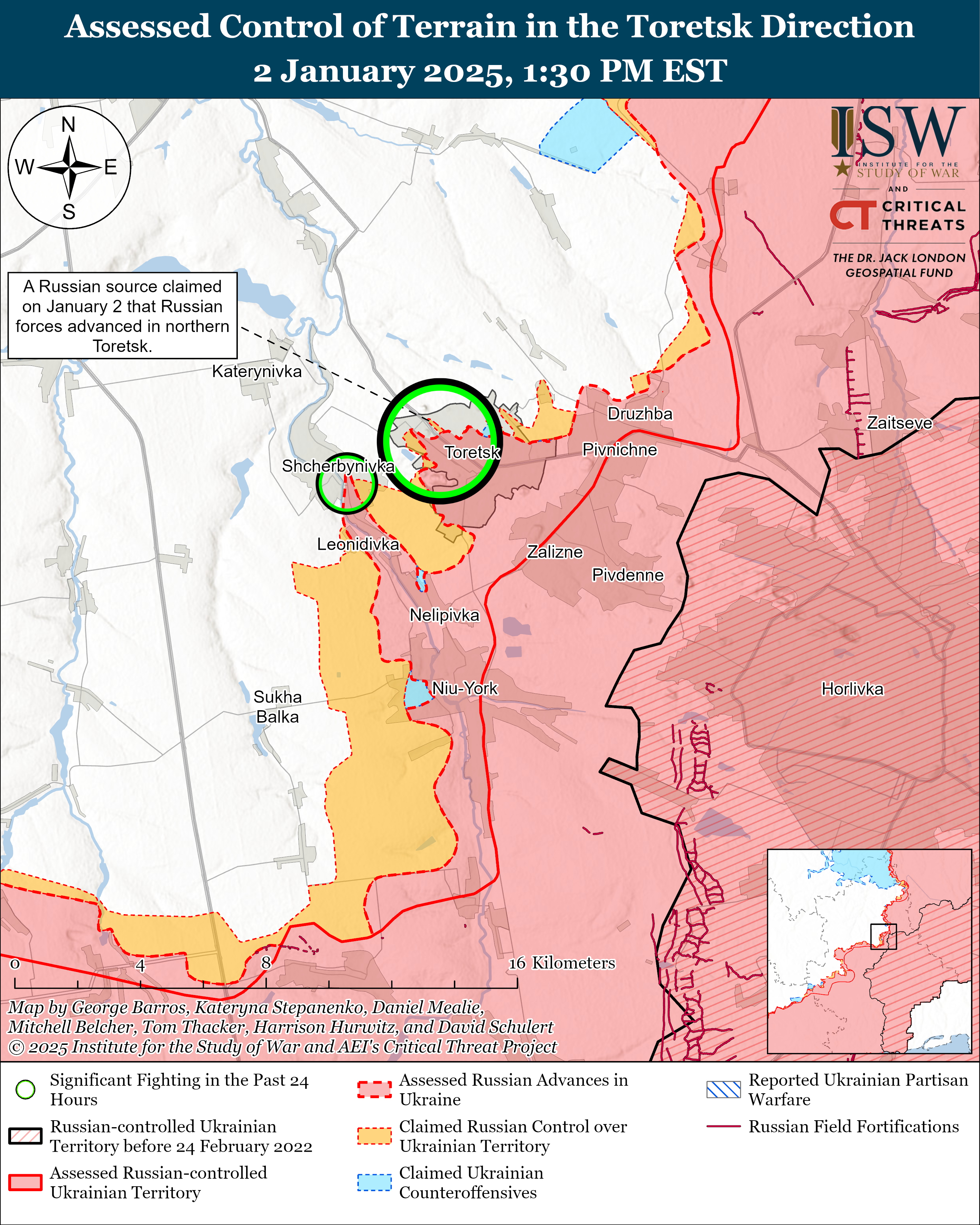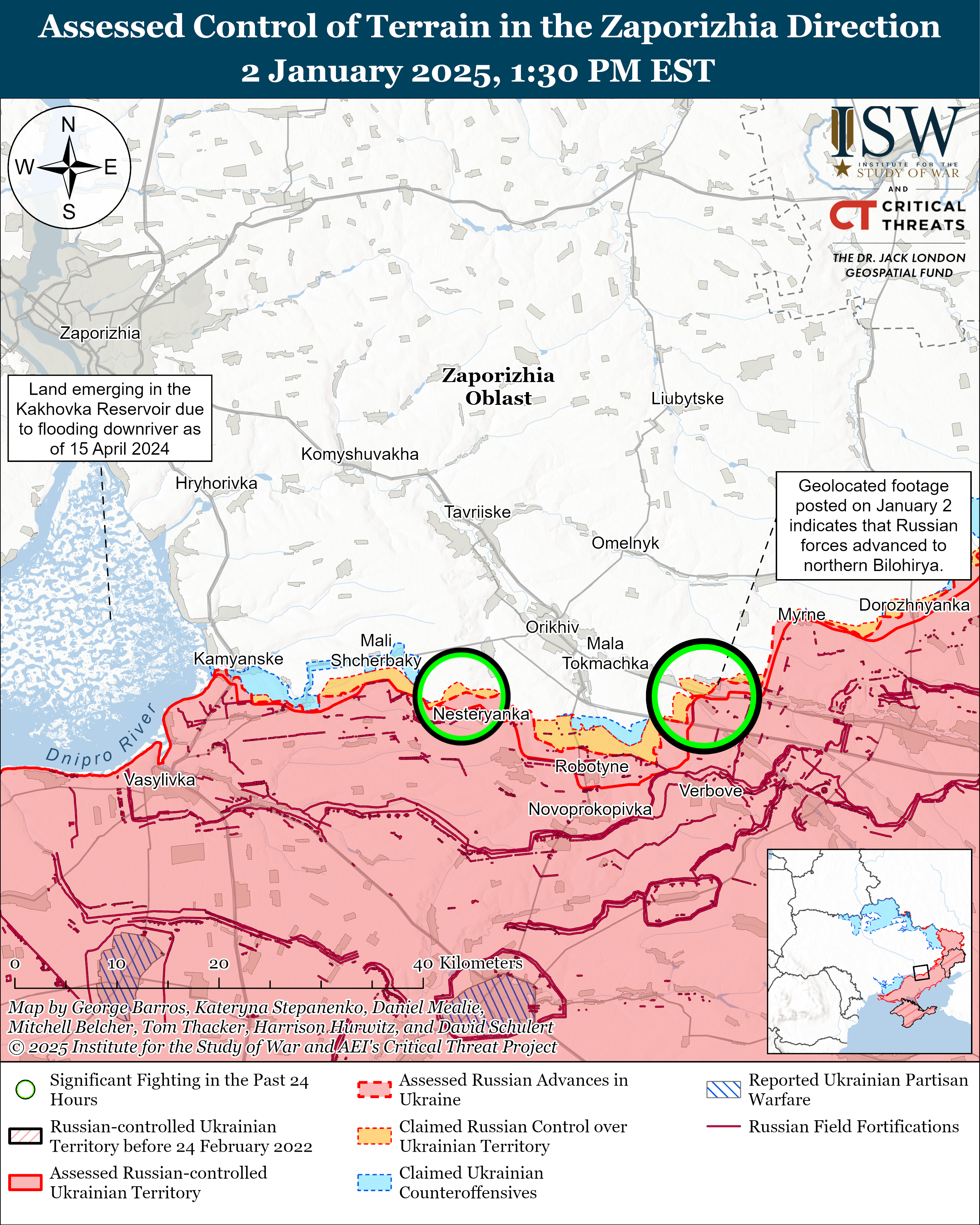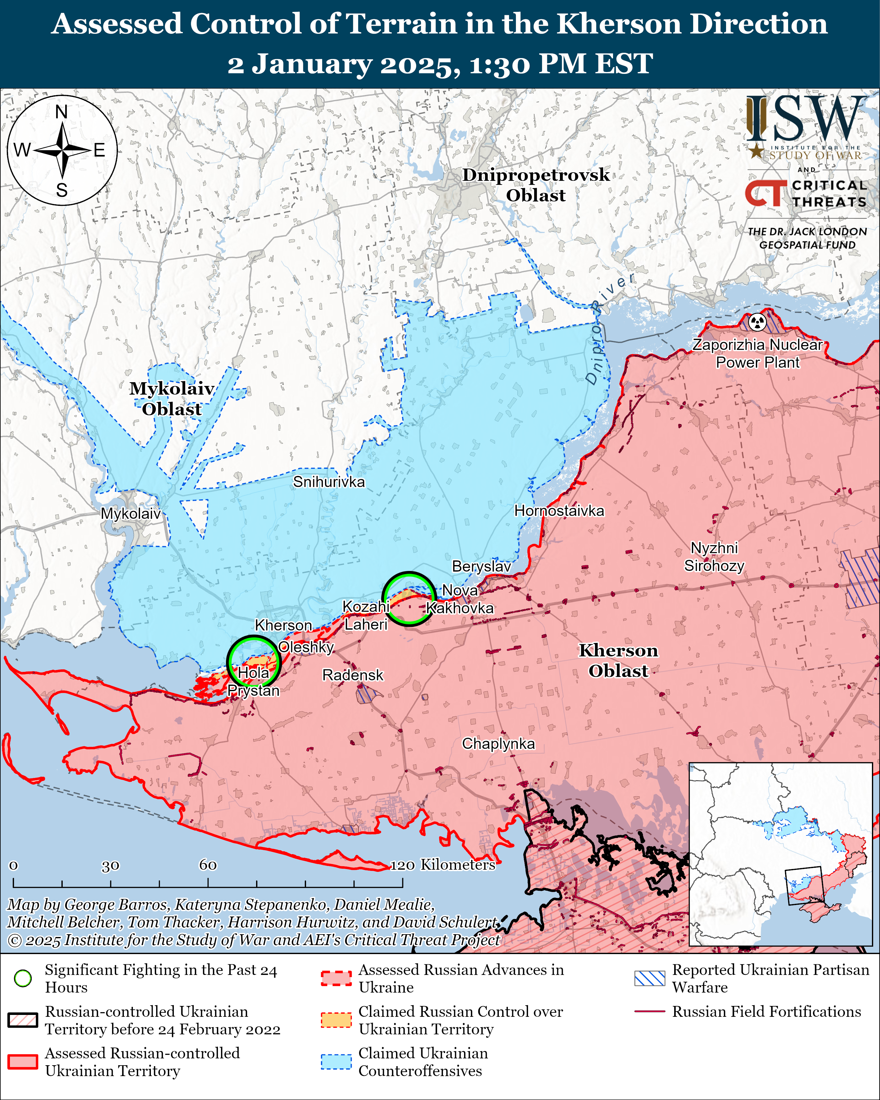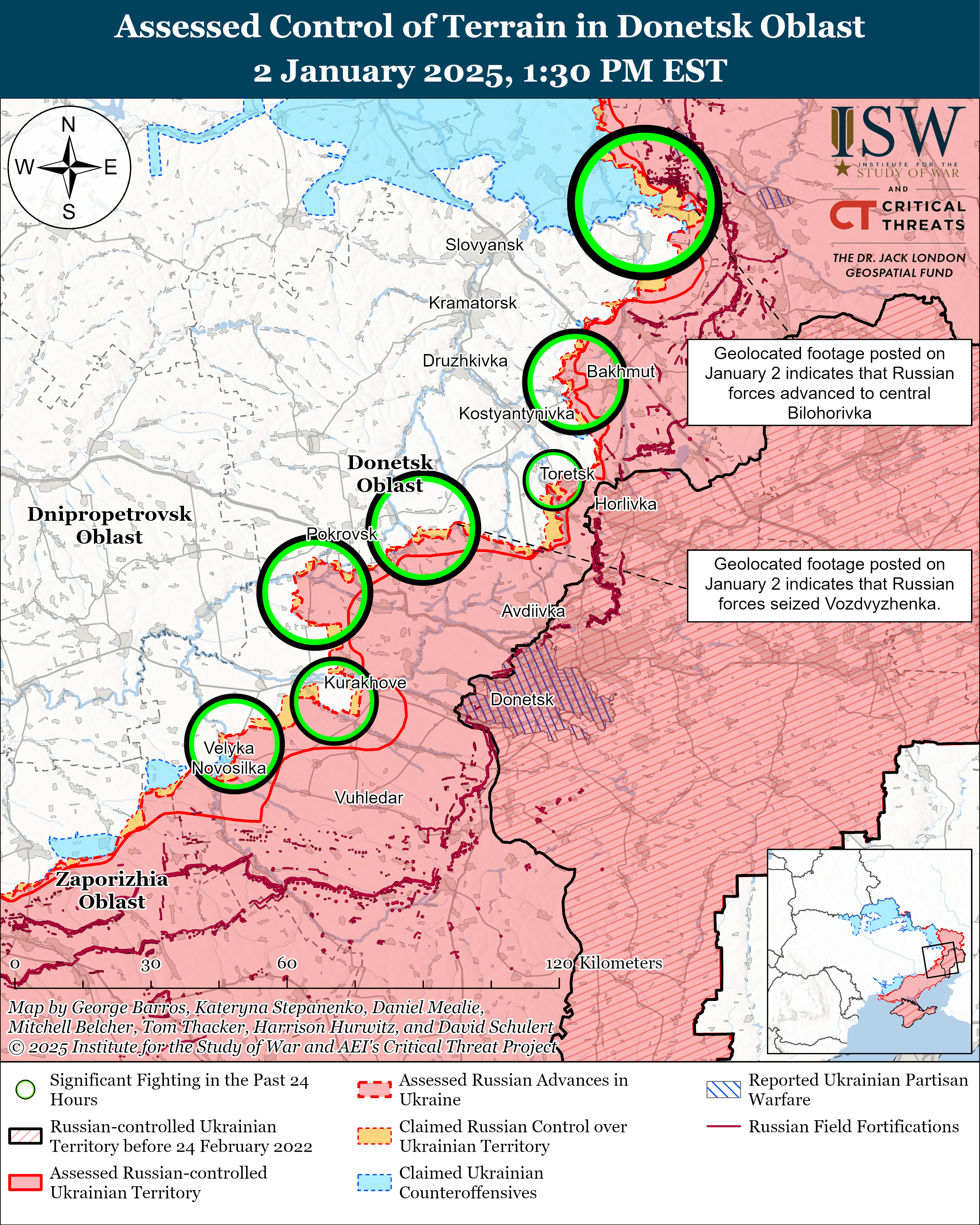 - Украинские и российские войска продолжали боевые действия в Курской области 1 и 2 января, однако подтвержденных изменений линии фронта не было.