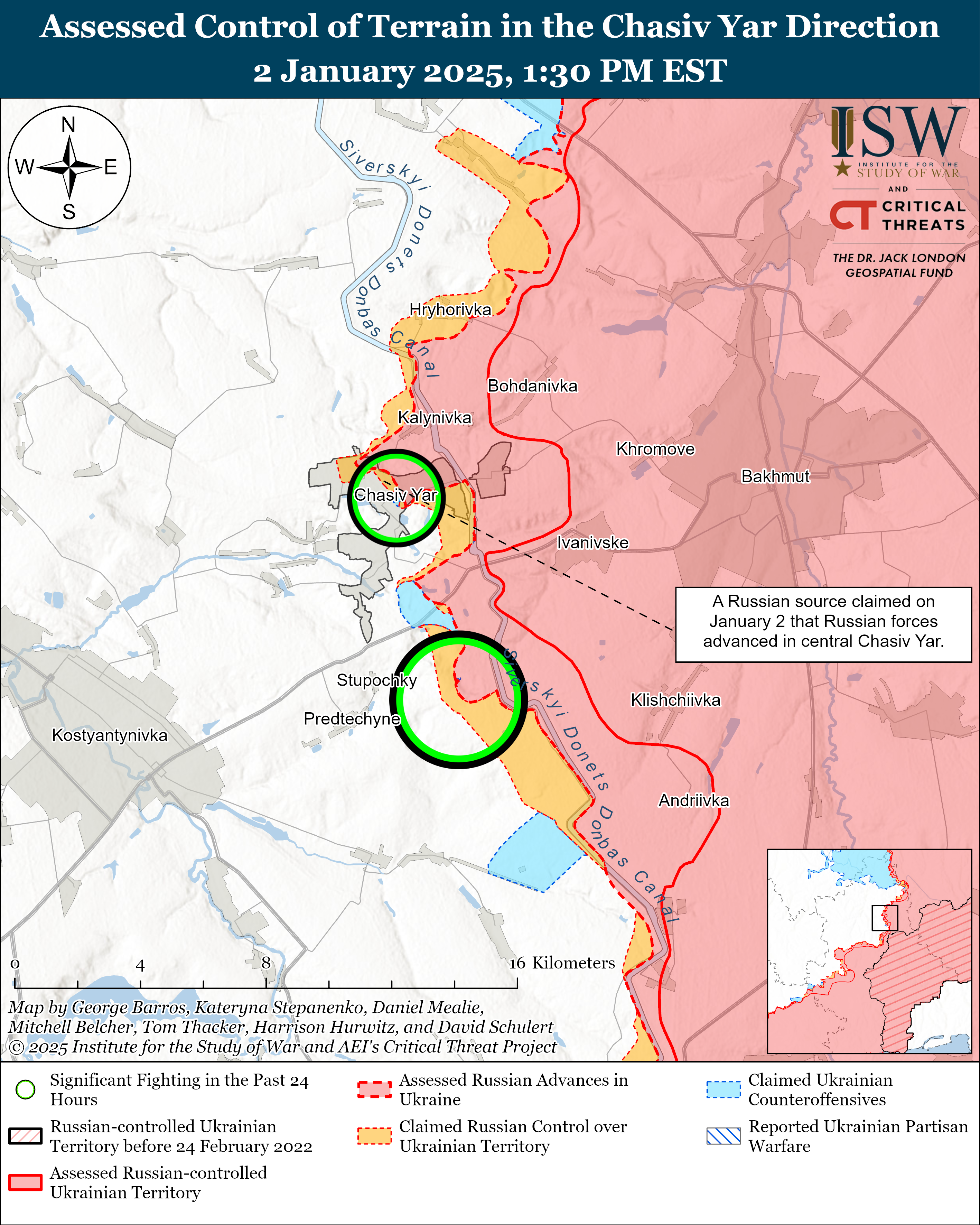 - Наступательные операции в направлении на Часов Яр продолжались, но россияне не сделали никаких подтвержденных наступлений 1 и 2 января.