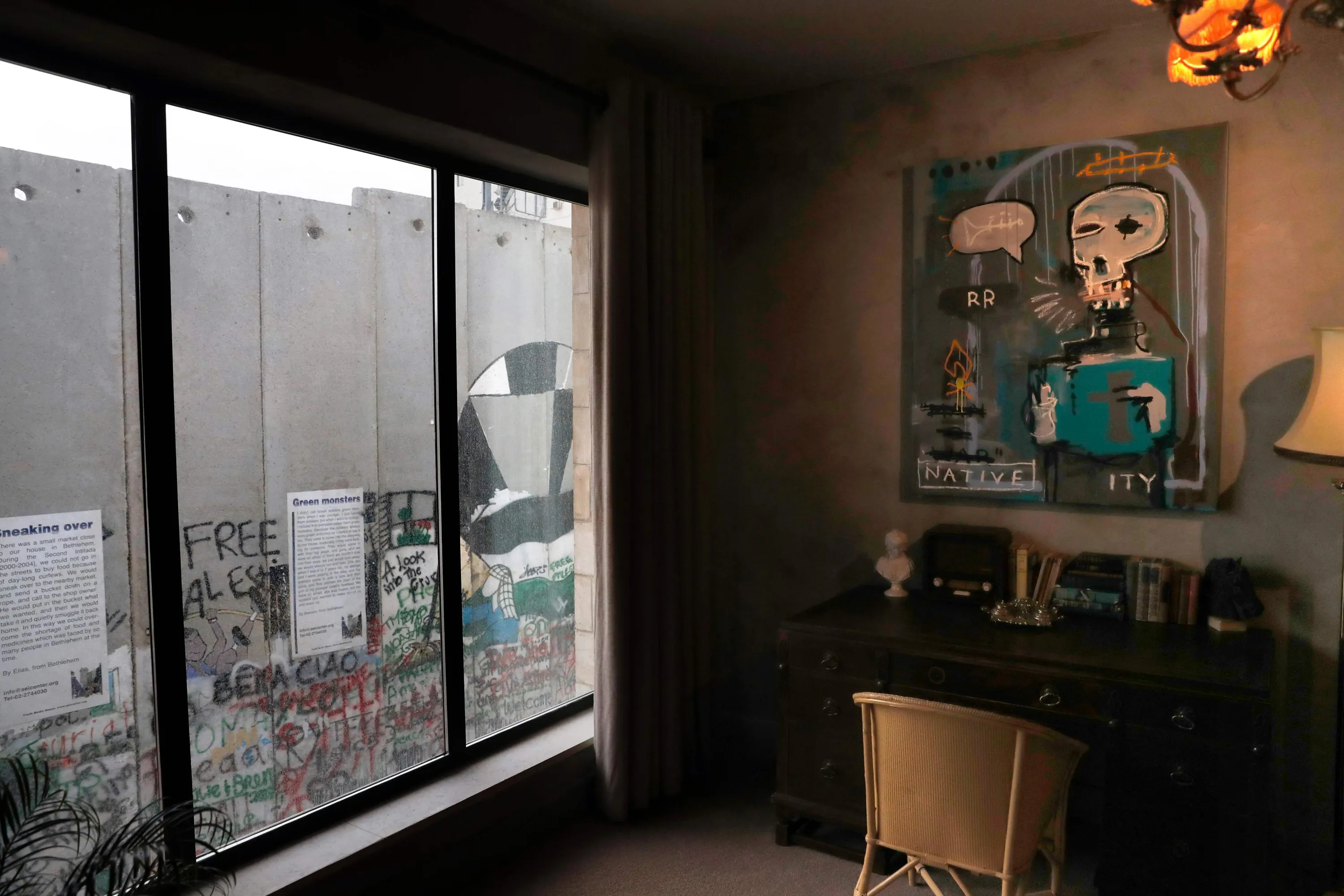Когда-то это был просто зловещий темно-серый забор со сторожевыми вышками. Но несколько лет назад знаменитый художник Бэнкси купил дом, стоящий вплотную к стене и создал в нем отель, рекламирующийся как гостиница с худшим на свете видом.