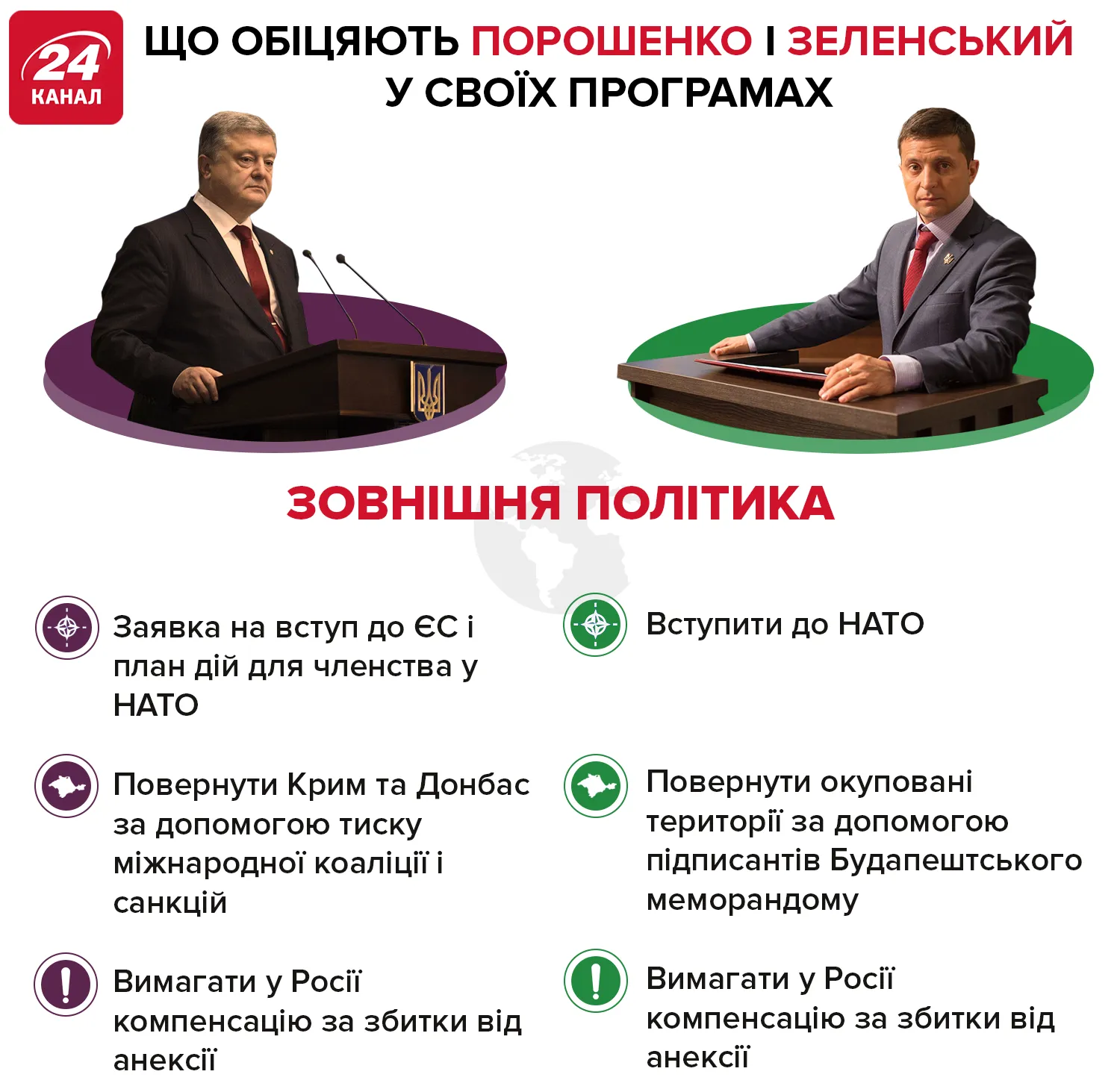 Действующий президент Петр Порошенко обещает вступить в НАТО и ЕС, в частности уже в 2023 году подать заявку в Евросоюз и получить план действий по членству в Альянсе. В то же время Владимир Зеленский вспоминает только о НАТО и стандартах для армии. О евроинтеграции не говорит ничего.