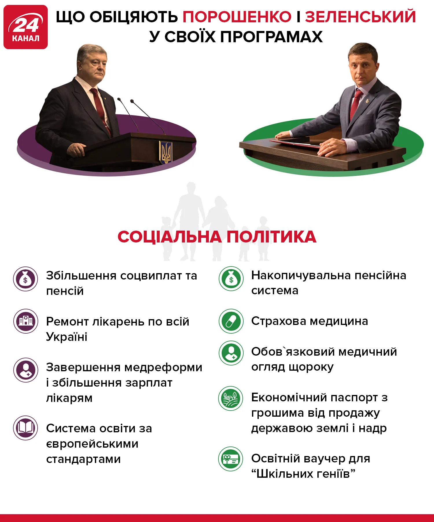 Действующий гарант обещает повысить пенсии и выплаты многодетным семьям, завершить реформу здравоохранения. Особенно акцентирует на изменениях в сельской медицине. Зеленский взамен обещает накопительную систему пенсий, страховую медицину.