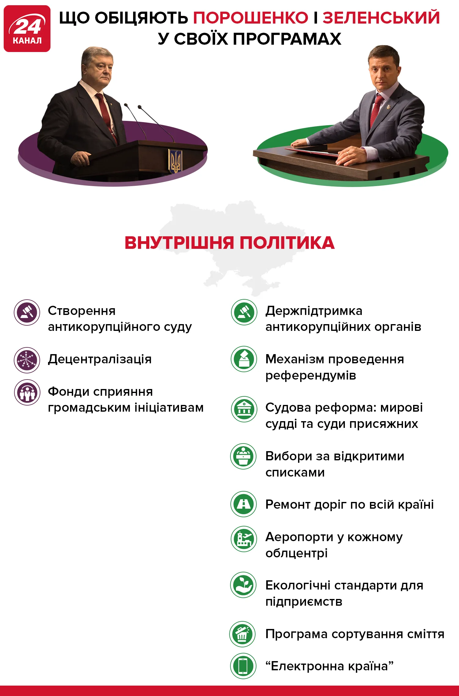 По внутренней политике кандидаты обещают тоже разное. Петр Порошенко собирается продолжать децентрализацию и наконец запустить Антикоррупционный суд.
