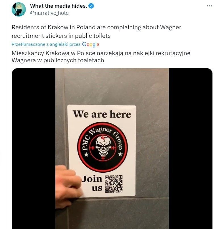 Польское СМИ Gazeta Krakowska сообщает, что на улицах Кракова начали появляться наклейки с рекламой российского ЧВК "Вагнера". Такие открытки стали появляться по всему городу.
