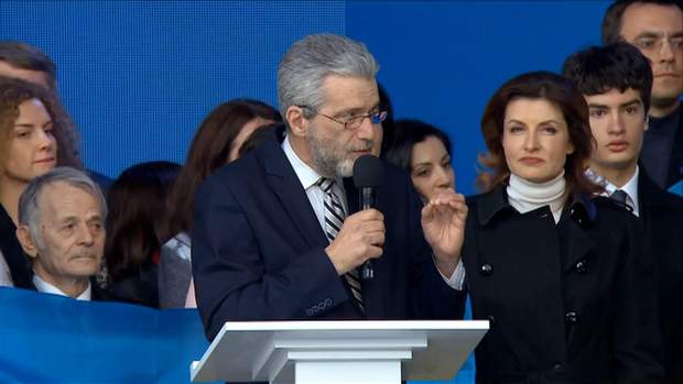 Кандидат в президенты Владимир Зеленский во время дебатов на "Олимпийском" стал на колени перед родными погибших на Донбассе военных. Петр Порошенко также опустился на колени и поцеловал флаг Украины.