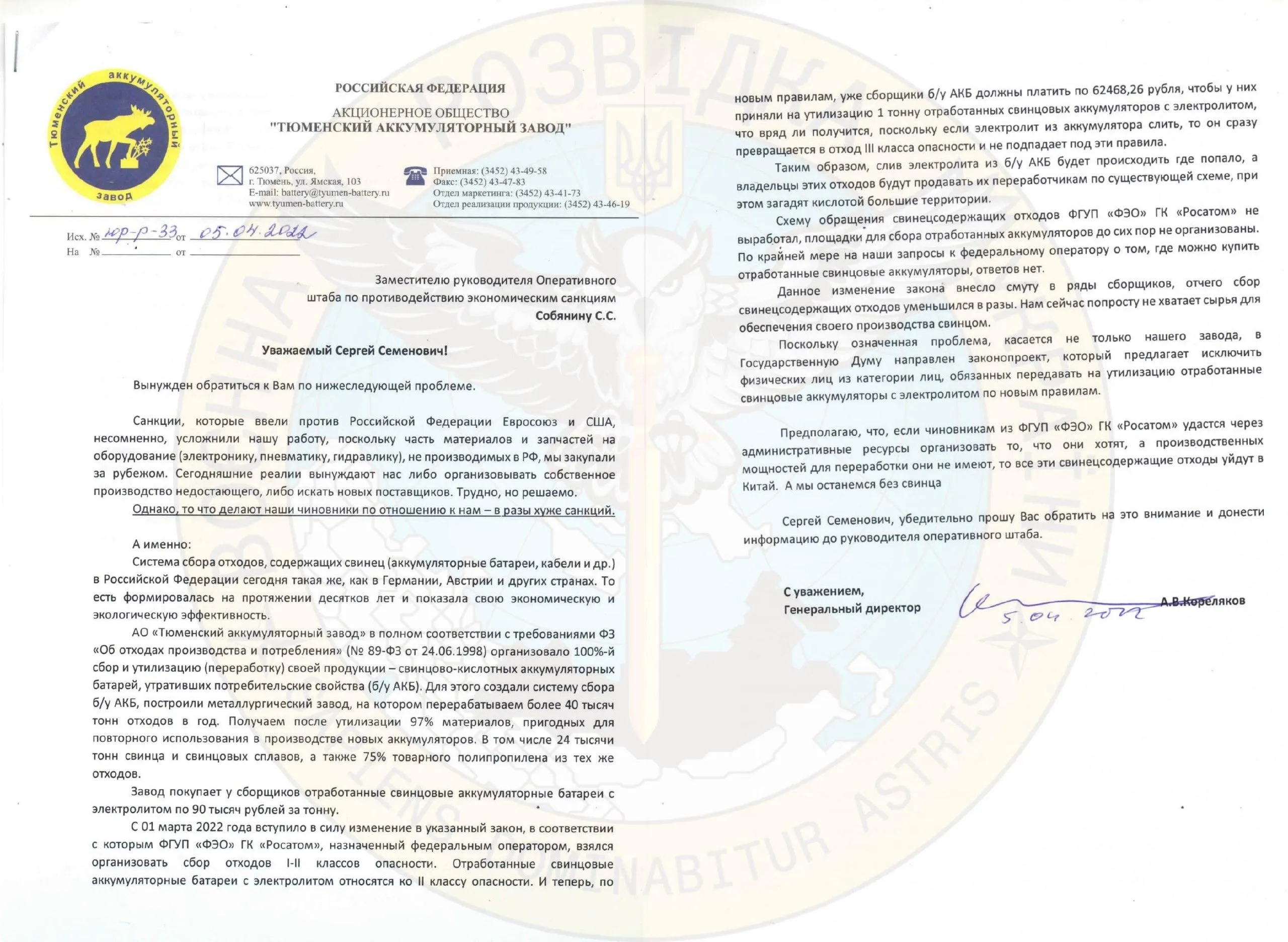 Об этом известно из письма от имени АО "Тюменский аккумуляторный завод" к "заместителю руководителя оперативного штаба по противодействию экономическим санкциям" Сергею Собянину.