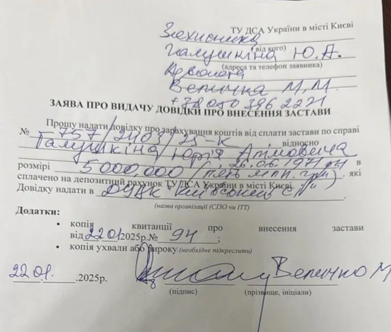 Заявление о выдаче справки о внесении залога за Юрия Галушкина / Фото Facebook/Михаил Величко