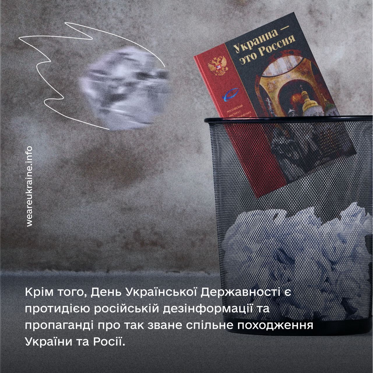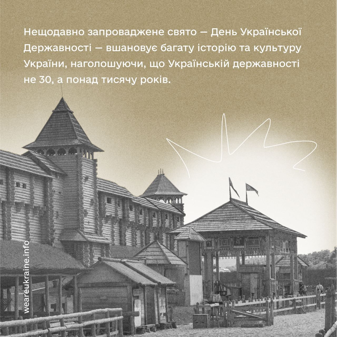 Праздник Дня государственности утверждает мнение о том, что современное государство Украина уходит корнями в старину, в частности, ведет свою родословную с княжеских времен. Выражение "Украина – Русь" принадлежит Михаилу Грушевскому, историку и политическому деятелю, главе УНР. Самое известное его произведение называется "История Украины – Руси" – это 10-томная монография. Она писалась на протяжении многих лет и положена в основу современного понимания исторических событий.