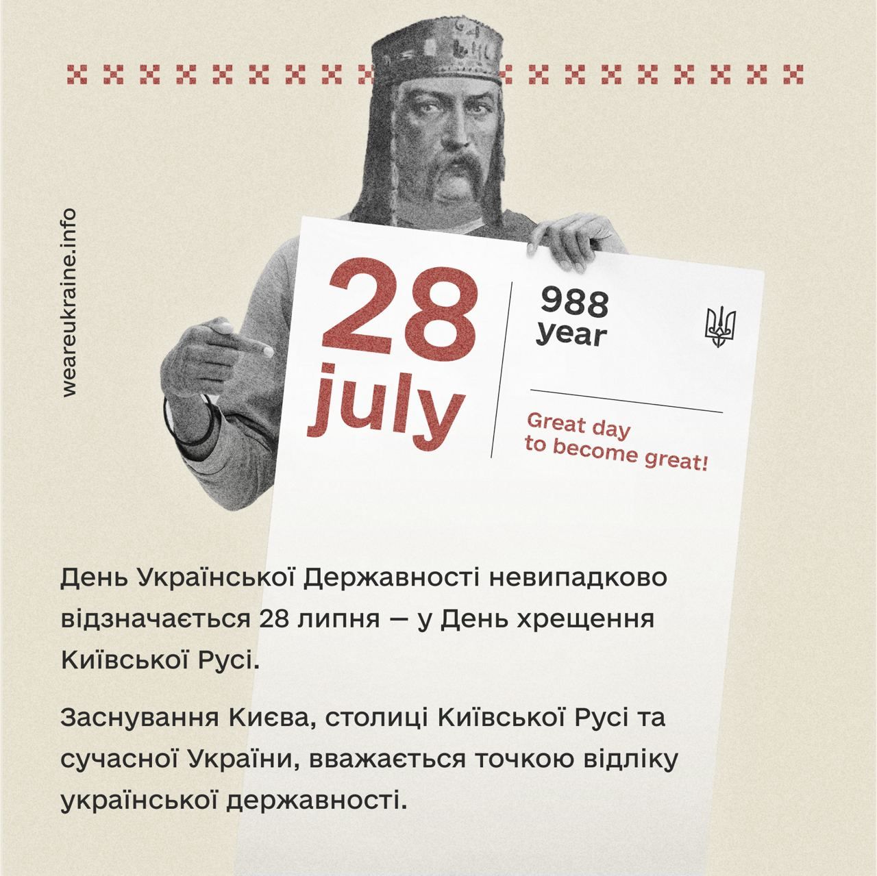 Мы не сироты и не найденыши. Мы потомки могущественной страны, которая была центром Европы. Здесь началась и наша государственность. Зарождение нашей государственности мы будем отмечать в день расцвета нашей государственности – в день Крещения Киевской Руси – Украины,