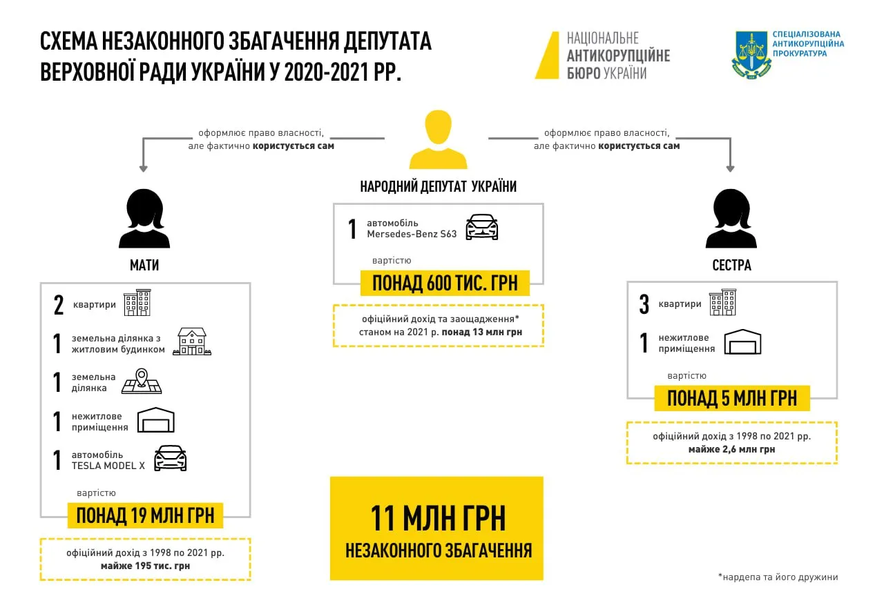 В рамках досудебного расследования следователи установили, что в 2020 – 2021 годах народный депутат приобрел в собственность активы стоимостью 25 миллионов гривен. В частности: