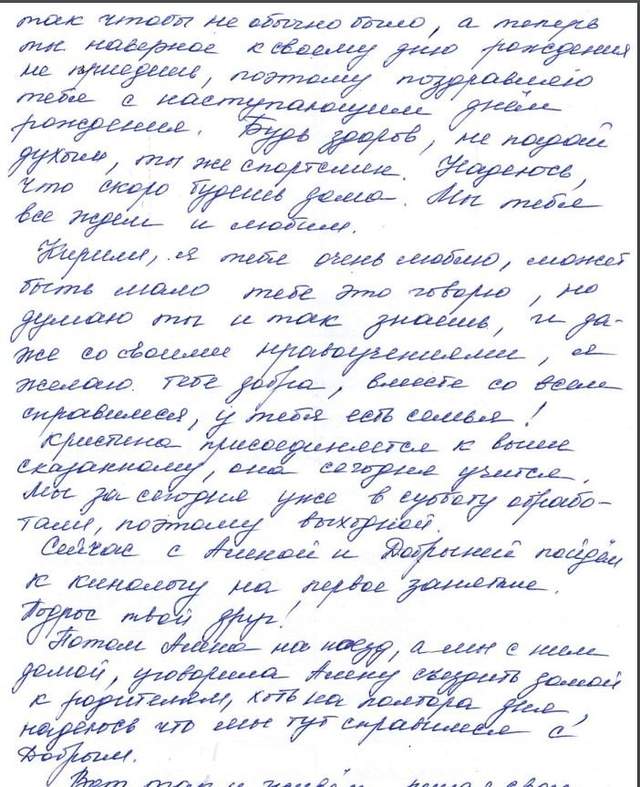 "Происходит что-то страшное и непонятное, но скоро все закончится и все вернутся домой. Я тобой очень горжусь… Привет тебе большой от моей мамы и отца. Они тебя сильно ждут, как сына. Папа молится за тебя и других ребят каждый день. И я молюсь каждый день, чтобы ты был цел и здоров. Я знаю, что ты у меня со всем справишься.