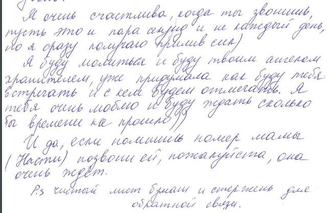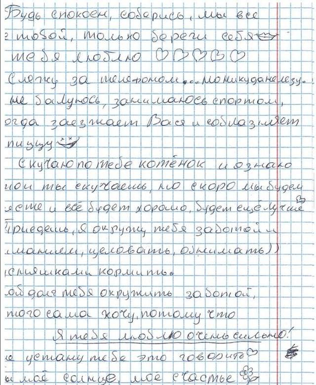 "Тебе там нелегко, я все понимаю, я верю и жду, очень скучаю и люблю. Настя и бабушка передают тебе большой привет и очень ждут и скучают по тебе... Спасибо, что звонишь мне, когда есть шанс. Твой голос для меня как огонек надежды и веры, когда опускаются руки... Я тебя очень люблю и мы с тобой со всеми трудностями справимся, неважно, как будет тяжело, мы всегда всех порвем... Я буду молиться и буду твоим ангелом-хранителем. Уже придумала как буду тебя встречать, и с кем будем отмечать. Я тебя очень люблю и буду ждать, сколько бы времени не прошло…"