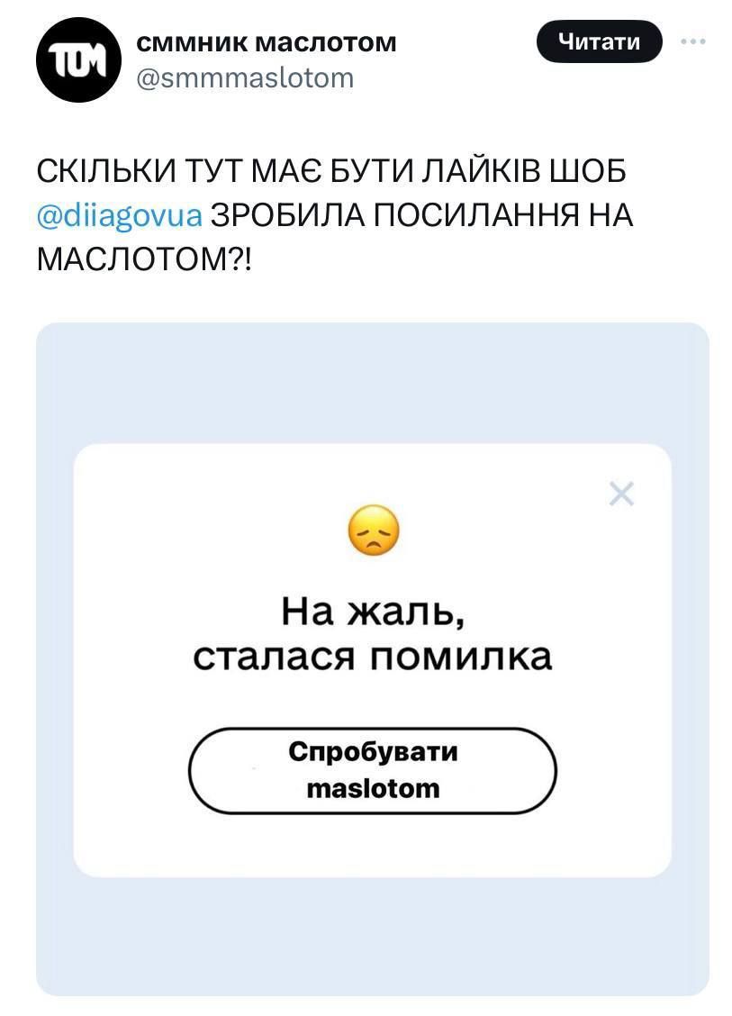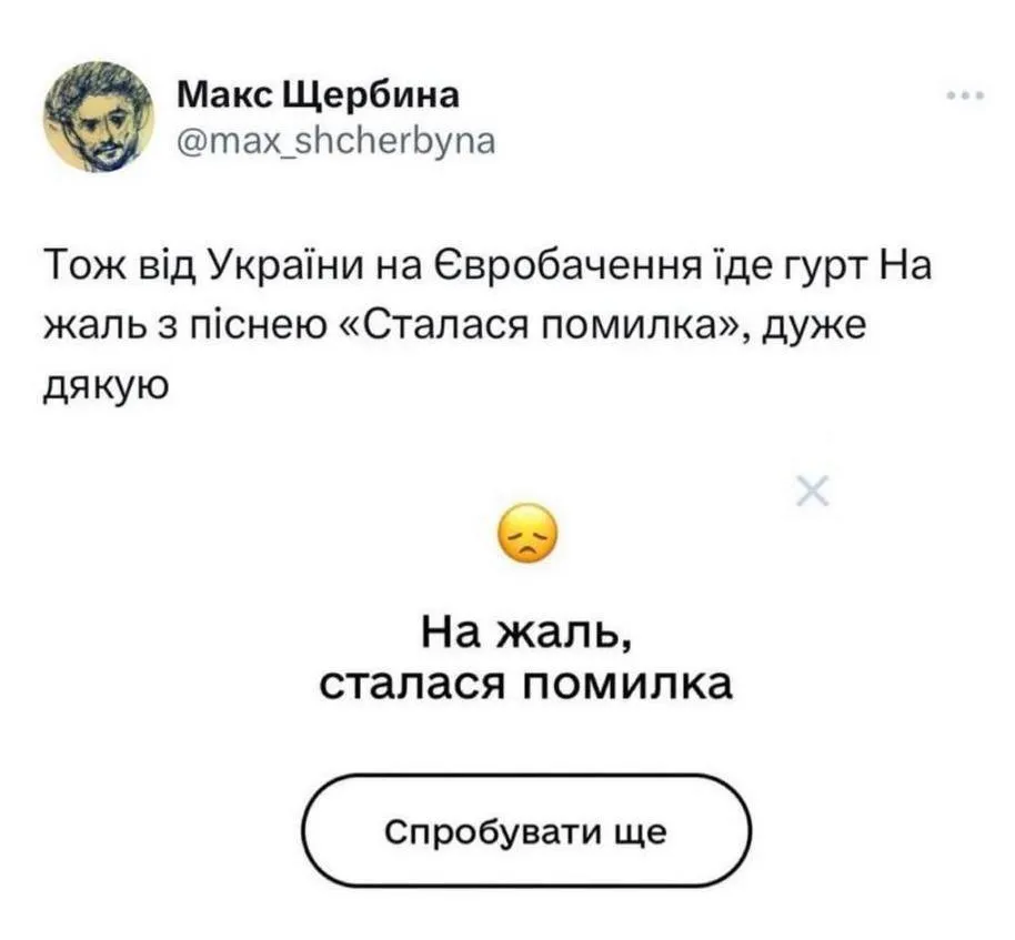 Журналист Макс Щербина очень метко пошутил по этому поводу. Он написал, что от Украины на Евровидение поедет группа На жаль, а представит он песню "Случилась ошибка". Именно эти слова украинцы видели в течение нескольких часов, пока приложение Дия упорно не давало им возможности отдать свой голос.