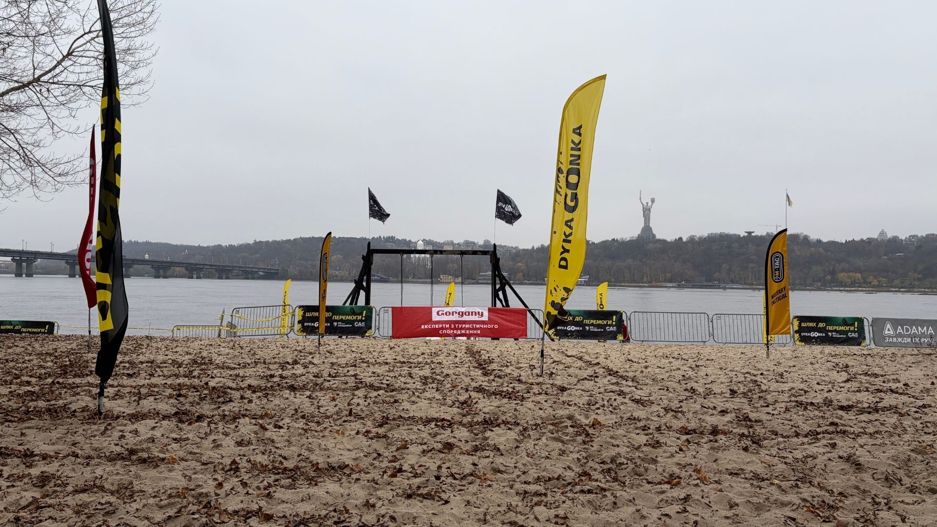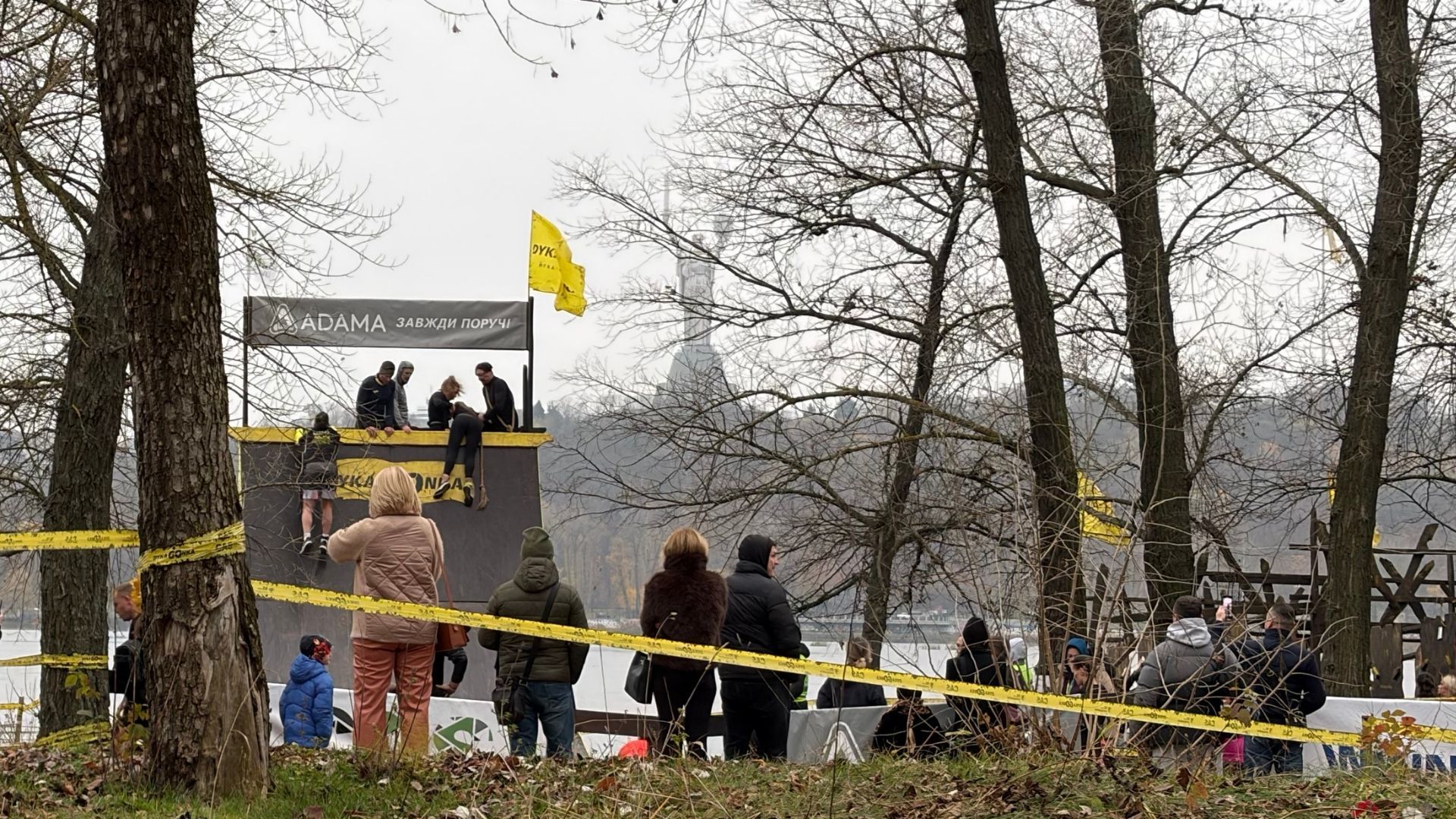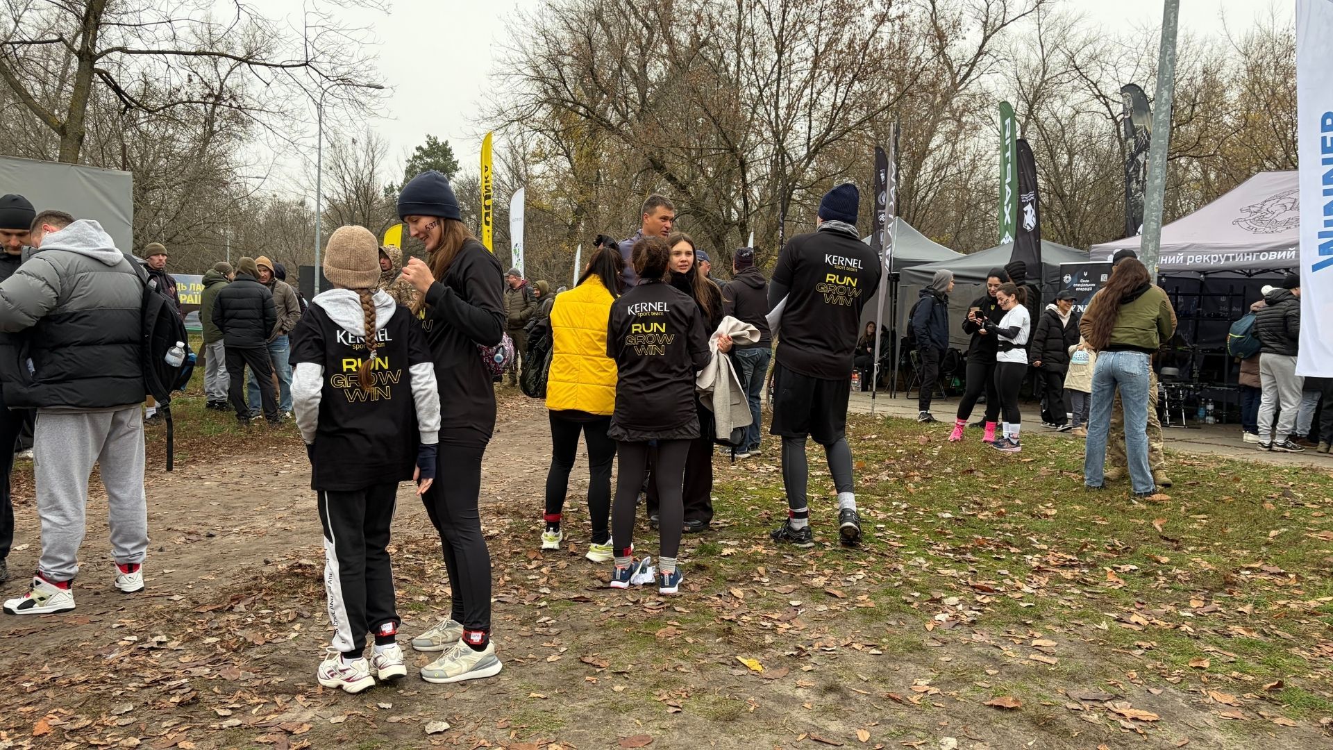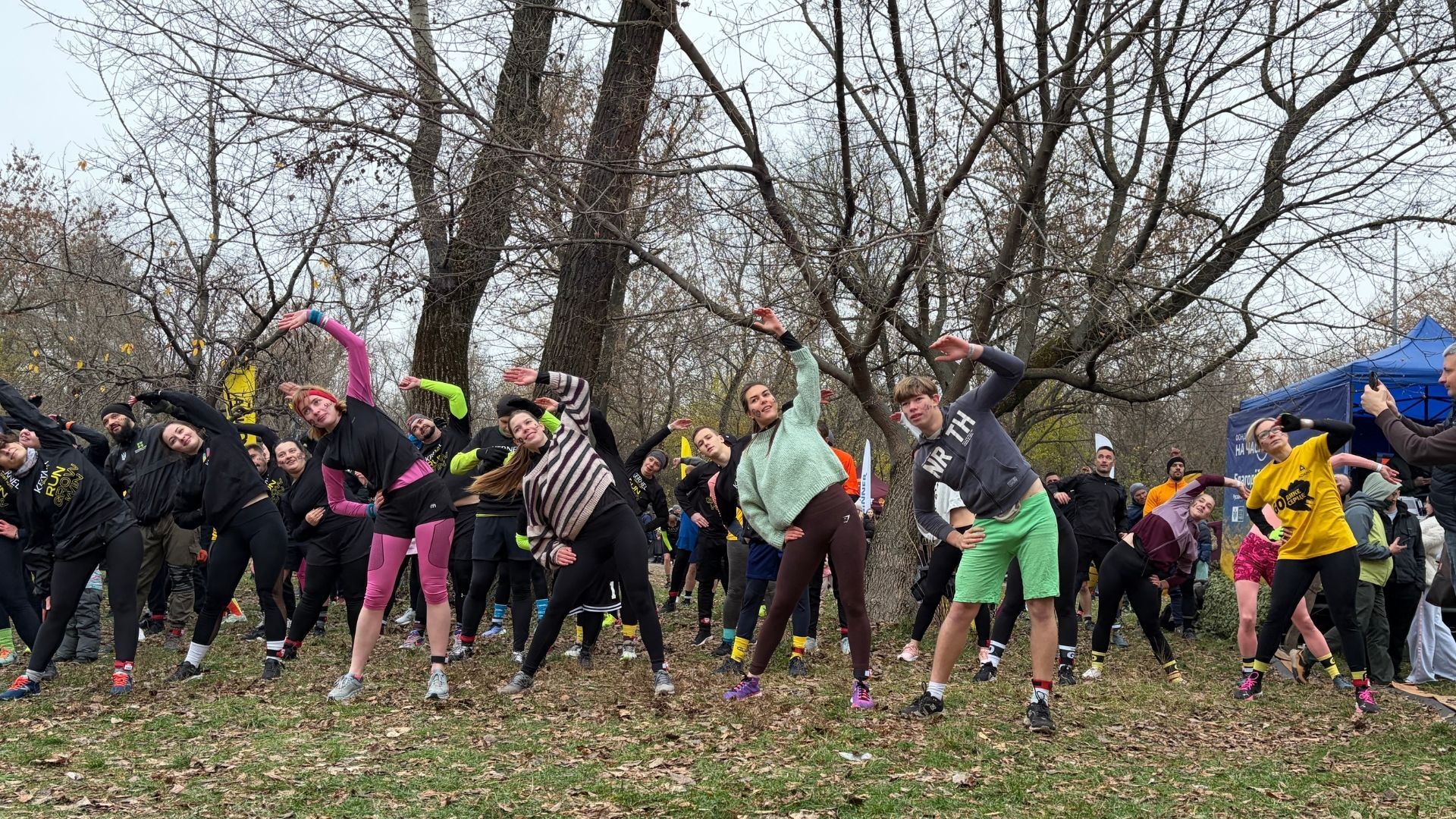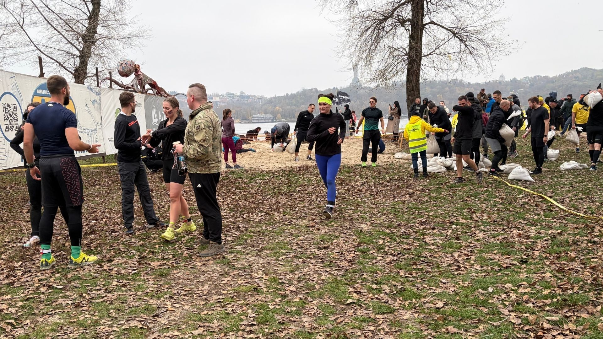 На дворе прохладно, с Днепра дует ветер, а участникам "Дикой Гoнки" ничего не мешает. Сотни людей приготовились к забегу – надели спортивные формы и сделали разминку.