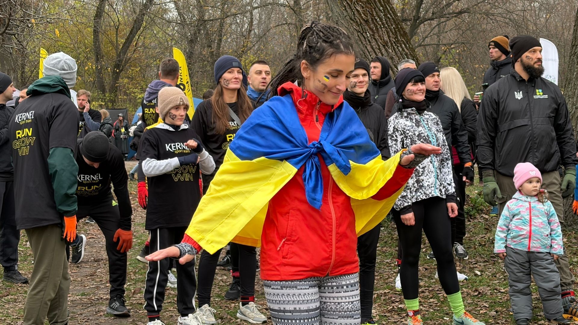 Затем все вместе немного разогрелись под трек "Доброе утро, Украина" с зажигательным основателем "Дикой Гoнки" и благотворительного фонда "На часі", а сейчас военным 33 отдельной механизированной бригады ВСУ Русланом Клименко и отправились в 5-километровый забег.