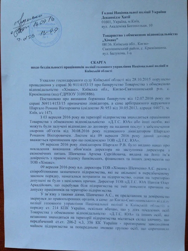 Представители "Химакса" неоднократно обращались в Киево-Святошинское отделение полиции ГУ Нацполиции в Киевской обл. по факту незаконного нахождения на территории предприятия "Д.Т.С. ЮА" и других лиц, а также противоправного завладения имуществом предприятия по предварительному сговору группы лиц, что повлекло тяжелые последствия; самоуправства" и т.д.