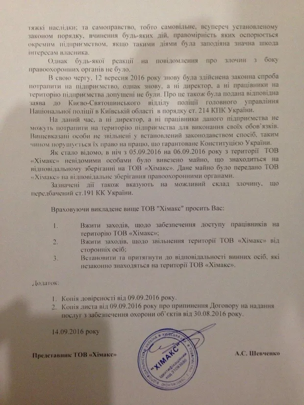 "Однако никакой реакции на сообщения о преступлении со стороны правоохранительных органов не было, – пишет в обращении к Х. Деконаодзе Артем Шевченко и просит главу Нацполиции вмешаться в конфликт и применить меры по обеспечению доступа работников на территорию "Химакса", освобождению ее от посторонних лиц и привлечению их к ответственности.