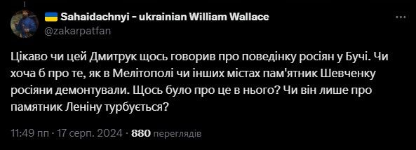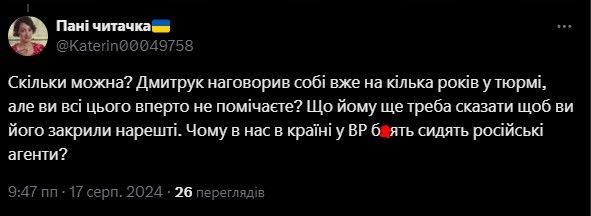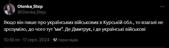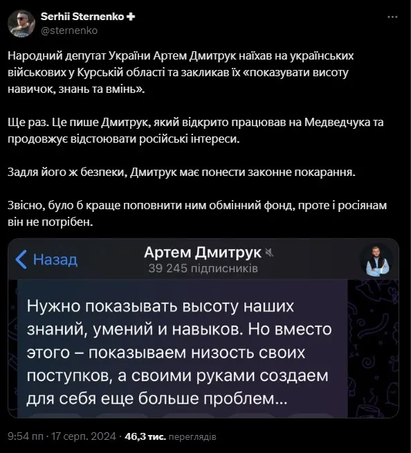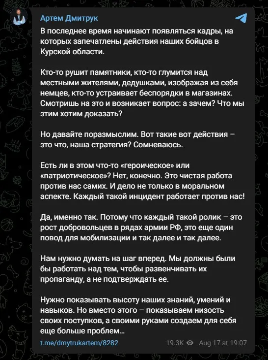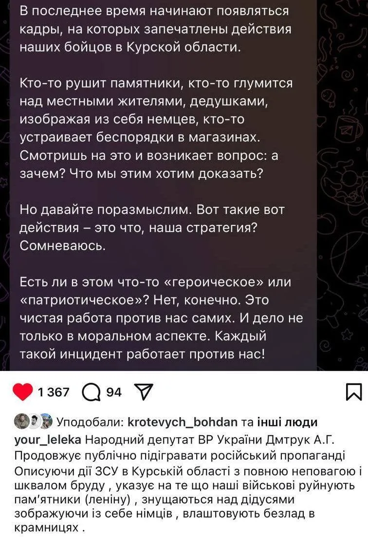 Вечером 17 августа нардеп Дмитрук опубликовал в телеграм-канале сообщение, в котором раскритиковал ВСУ. Он начал распространять пророссийские нарративы, заявляя о якобы "мародерстве" и "издевательствах над гражданскими". Более того, он сравнил украинских защитников с немецкими фашистами.