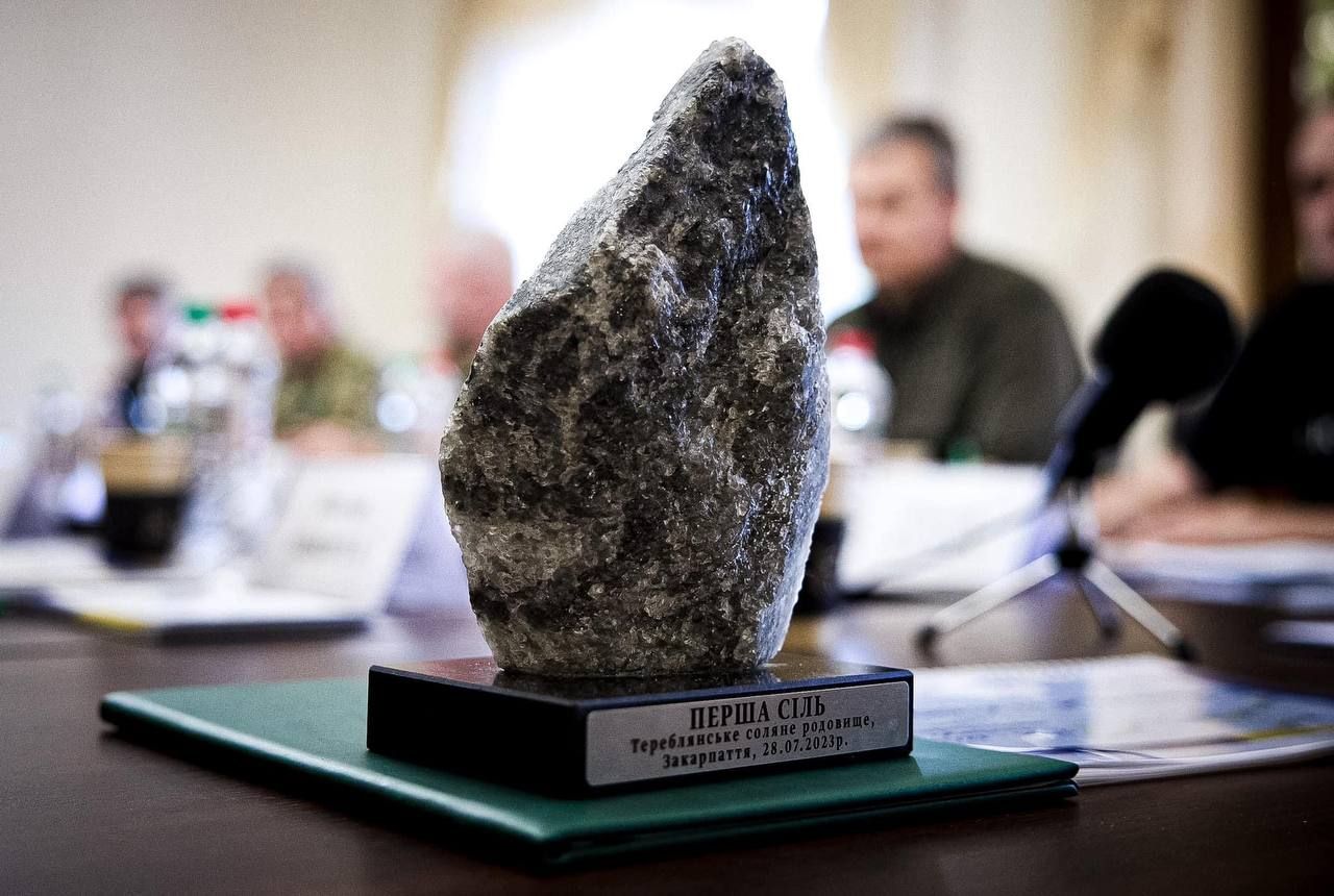 Во время координационного совещания по экономической, социальной и безопасности ситуации в Закарпатской области под руководством Президента Владимира Зеленского передал главе государства первую соль, добытую в рамках разработки Тереблянского соляного месторождения на Тячевщине,