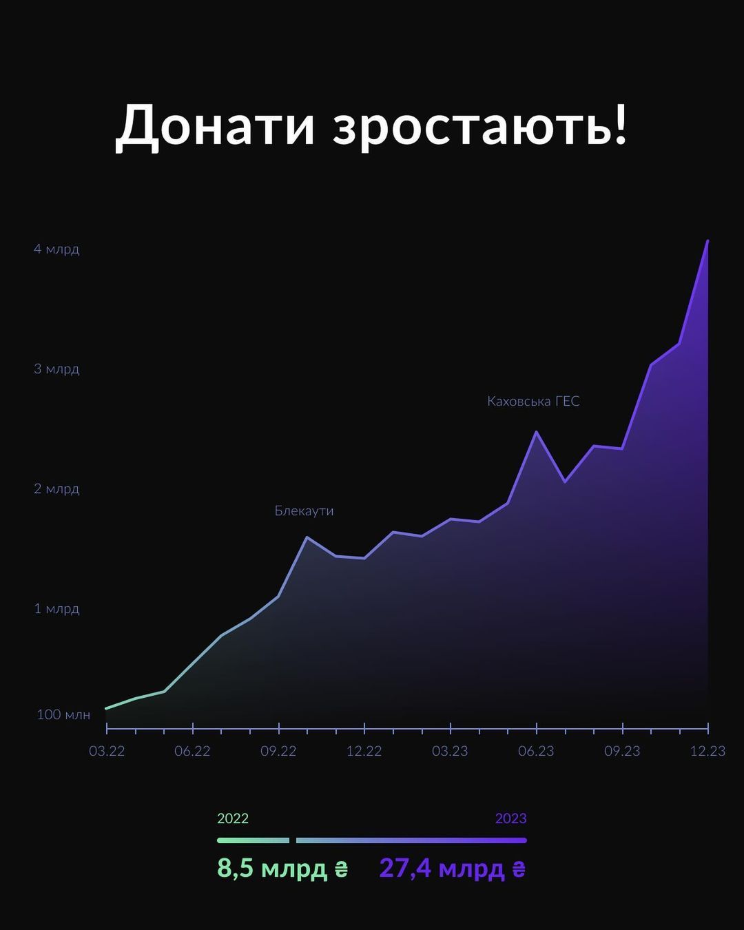 Также согласно опубликованным данным, средний донат в 2023 году составил 349 гривен, по сравнению с 258 гривен в прошлом году. Всего люди задонатили на банки 27,4 миллиарда гривен – против 8,5 миллиарда в прошлом году.
