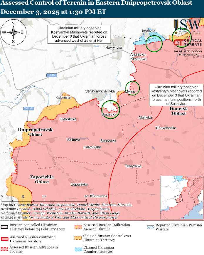 Также защитники имели успех в тактической зоне Константиновка – Дружковка. Геолоцированные кадры за 1 декабря свидетельствуют, что украинские силы продвинулись на запад от Иванополья (юго-восток от Константиновки).
