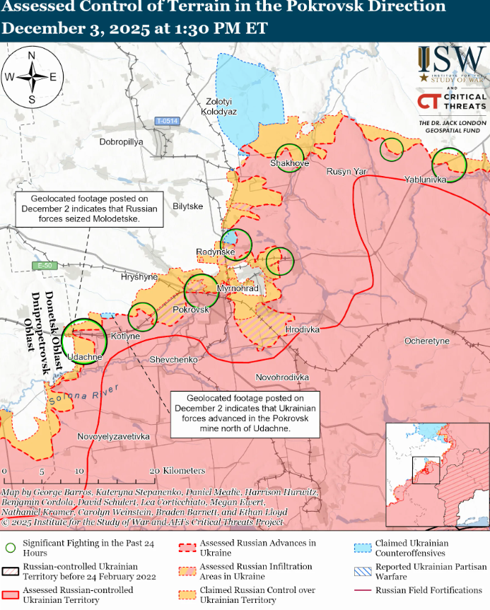 Кадры за 3 декабря показывают, что российские силы вероятно захватили Молодецкое (юго-западнее Покровска).