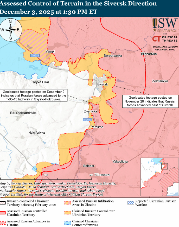 Геолоцированные кадры за 28 ноября показывают, что российские войска недавно немного продвинулись на восток от Северска. Снимки за 2 декабря, свидетельствуют, что оккупанты продвинулись и в восточной части Свято-Покровского (н юго-запад от Северска).