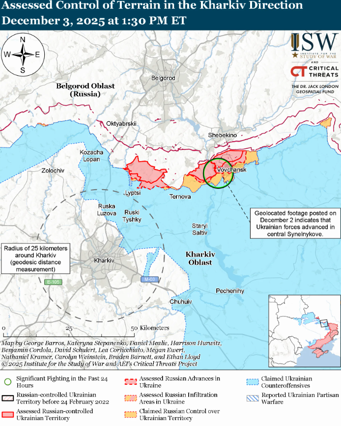 Геолоцированные кадры за 2 декабря показывают, что украинские силы недавно продвинулись в центральной части Синельниково (на северо-восток от Харькова).
