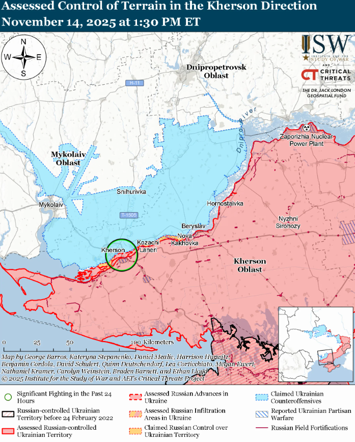 Кроме того, кадры за 13 ноября показывают, что российские войска нанесли удар по зданию в Шахматном, которое удерживали украинские силы. Это свидетельствует, что украинские подразделения удерживали позиции или недавно продвинулись в районе, где оккупанты заявляли о своем присутствии.