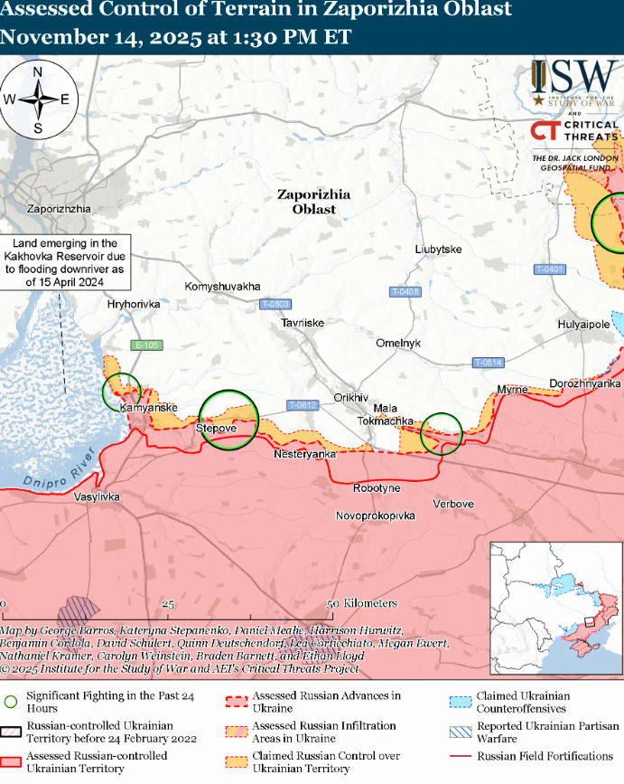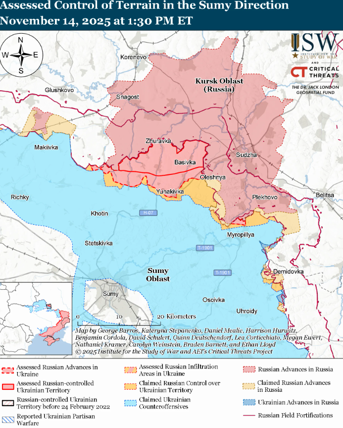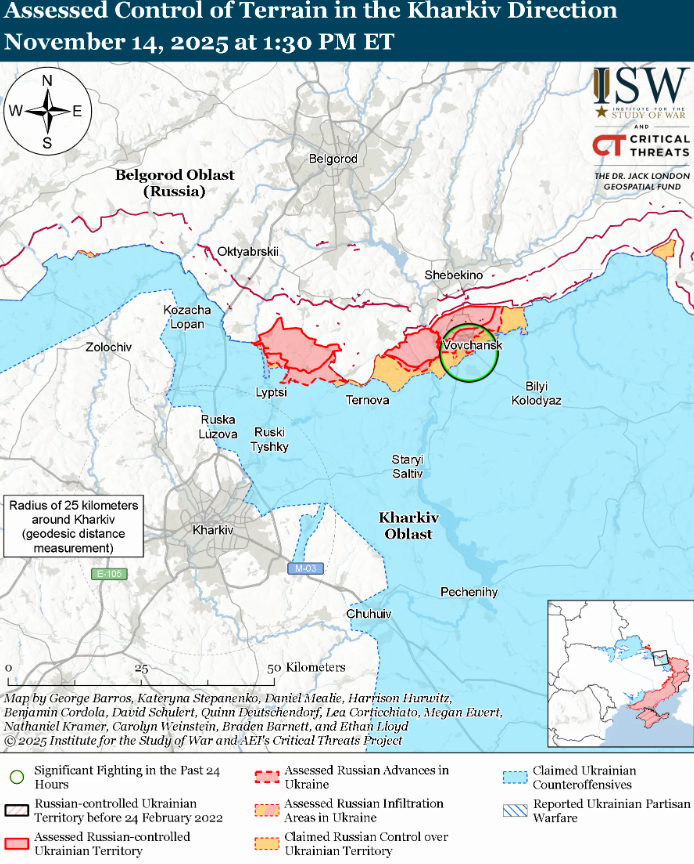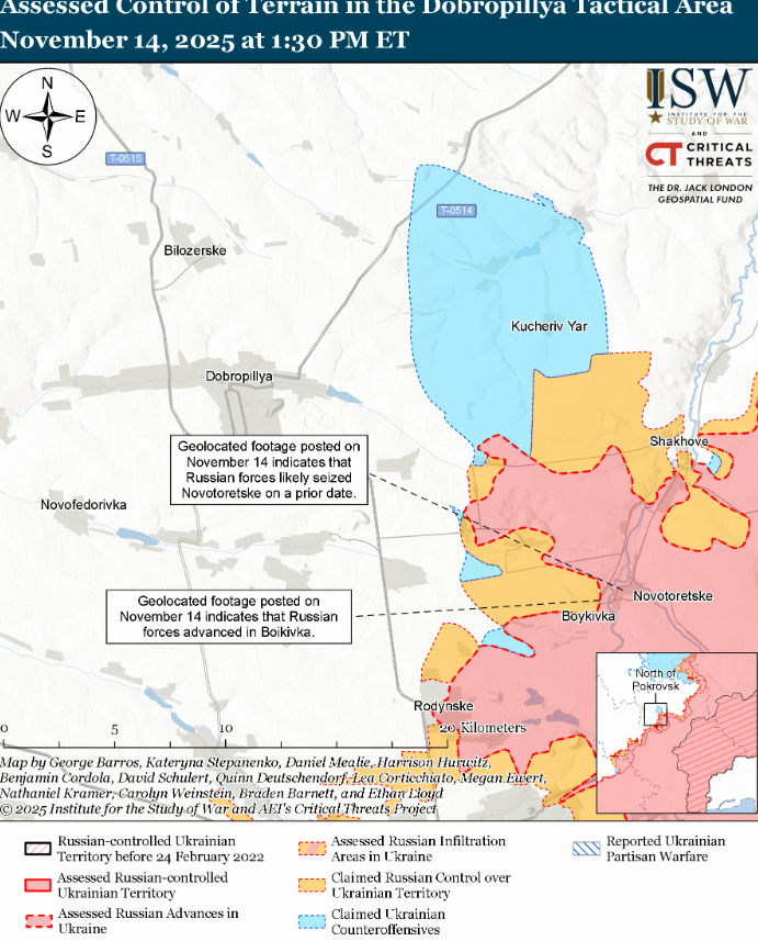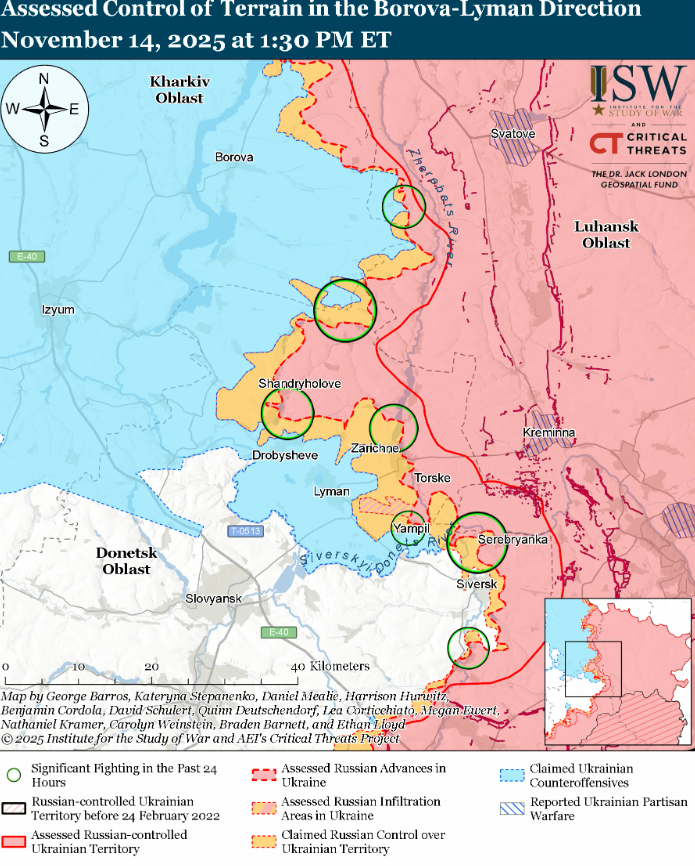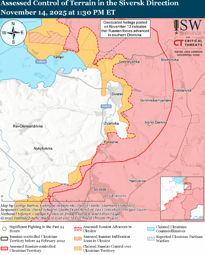 Геолоцированные кадры за 13 ноября также указывают, что Силы обороны недавно продвинулись на восток от Колесниковки, что на Харьковщине (на северо-восток от Боровой).