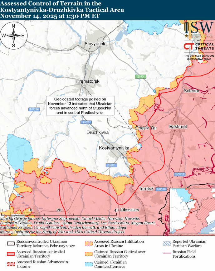 Снимки за 11 ноября указывают на то, что украинские силы удерживают позиции или недавно продвинулись в центральной части Предтечино (на восток от Константиновки) и вдоль трассы Н-32 Покровск – Константиновка к востоку от Константиновки.
