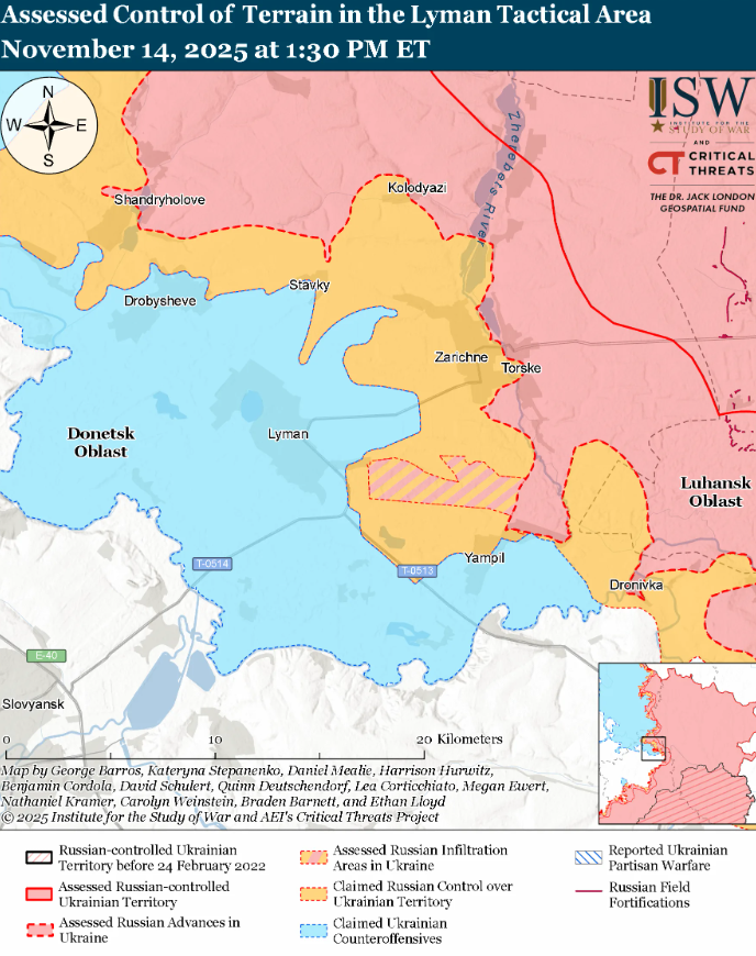 Также установлено, что украинские войска удерживают позиции или недавно продвинулись в северной части Дробышево (северо-запад от Лимана) – районе, где ранее россияне заявляли о своем присутствии.