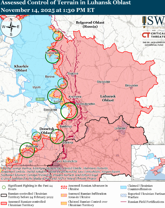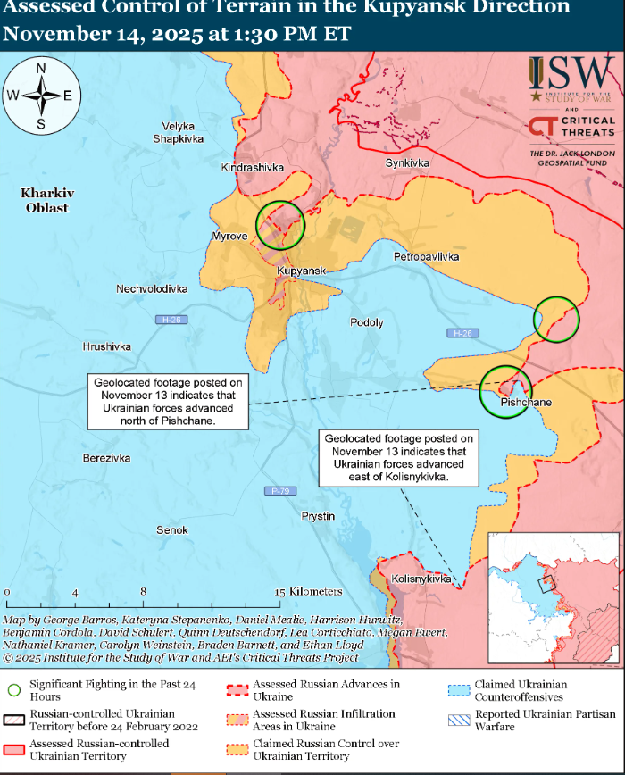 Геолоцированные кадры за 13 ноября свидетельствуют, что украинские силы недавно продвинулись на север от Песчаного (на юго-восток от Купянска).