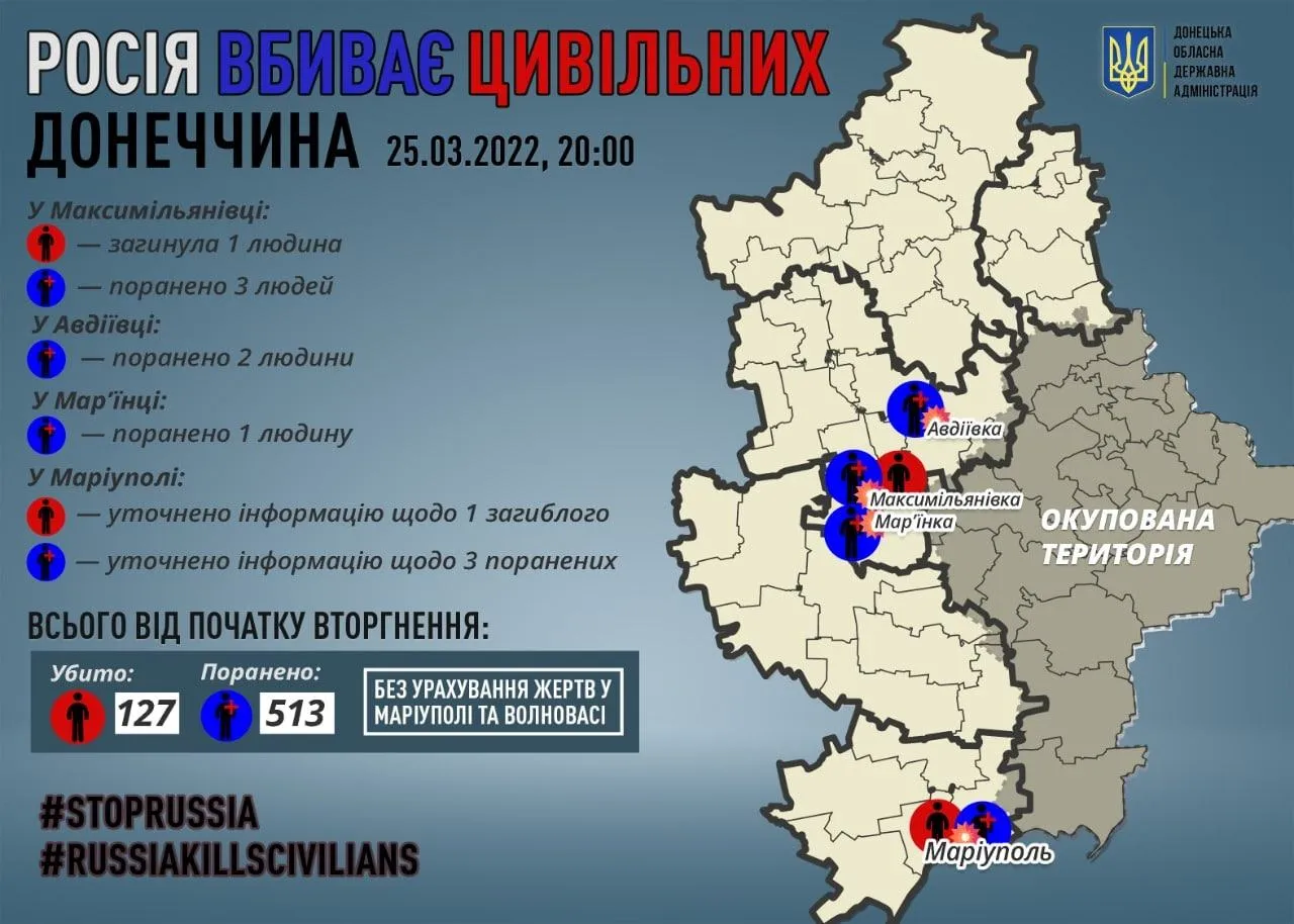 Кириленко написал, что 25 марта удалось уточнить информацию о 1 погибшем и 3 раненых в Мариуполе. В Максимильяновке погиб 1 ребенок, 3 человека получили ранения. Кроме этого, есть двое раненых в Авдеевке (в том числе 1 ребенок) и один ранен в Марьинке.
