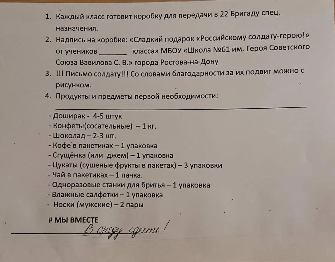 В школе №61 8-летним детям дали список того, что нужно принести на нужды русской армии. Здесь вермишель быстрого приготовления "Доширак", носки, сосательные конфеты, шоколад, одноразовые станки, влажные салфетки и пакетированный чай. Все вещи дети должны принести в школу в среду.