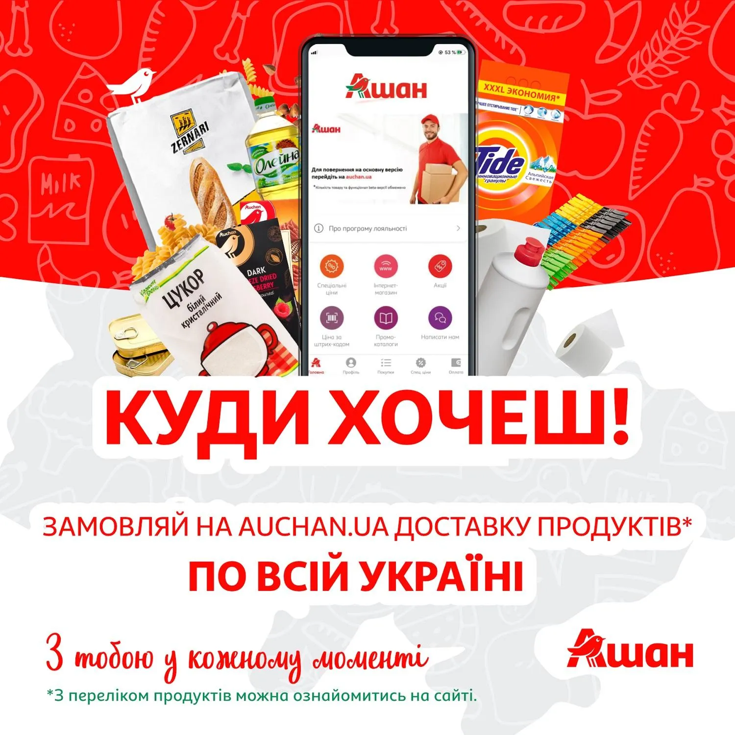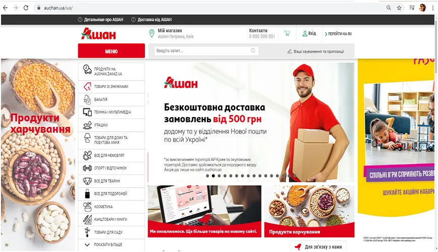 "Ашан" – это мультиформатная сеть, поэтому кроме гипермаркетов, супермаркетов и магазинов у дома, имеет электронную коммерцию. Сайт Ашан предлагает огромное количество товаров, которые привезут Вам под дверь. Кроме того, во время заказа можно выбрать опцию доставки в ближайшие к Вам отделение или поштомат "Новой почты". А в тех городах, где есть магазины сети, можно осуществить самовывоз из ближайшего магазина.