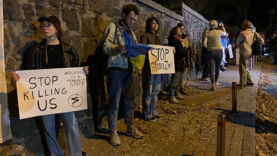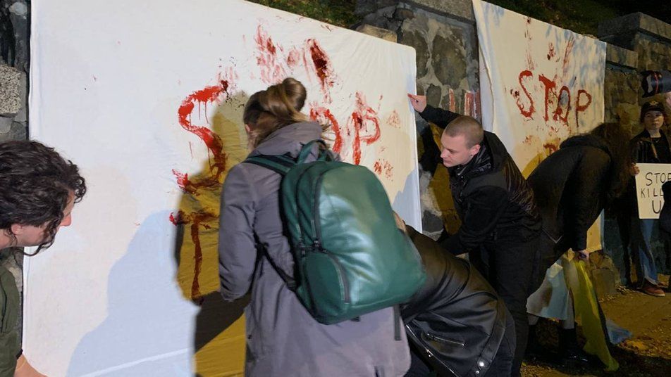 Как сообщает Суспільне, напротив посольства Ирана участники разбрасывали камни из дома, в который 17 октября попал дрон. Кроме того, они развернули баннеры на английском и фарси с призывом остановить убийства и терроризм.