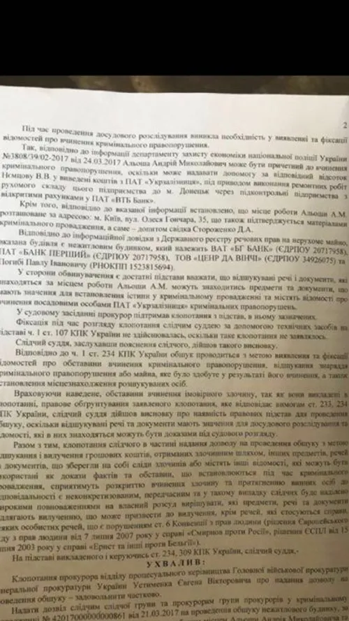 "Согласно информации Департамента защиты экономики Нацполиции, Андрей Алеша может быть причастен к совершению уголовного правонарушения, поскольку может оказывать помощь за соответствующий процент Немцову М.М. – (директор по вопросам безопасности "Укрзализныци" – ред.) в выводе денежных средств из ПАО "Укрзализныця" под предлогом выполнения ремонтных работ подвижного состава этого предприятия в г. Донецк через подконтрольные предприятия с открытыми счетами в ПАО "ВТБ Банк", – говорится в судебном решении.
