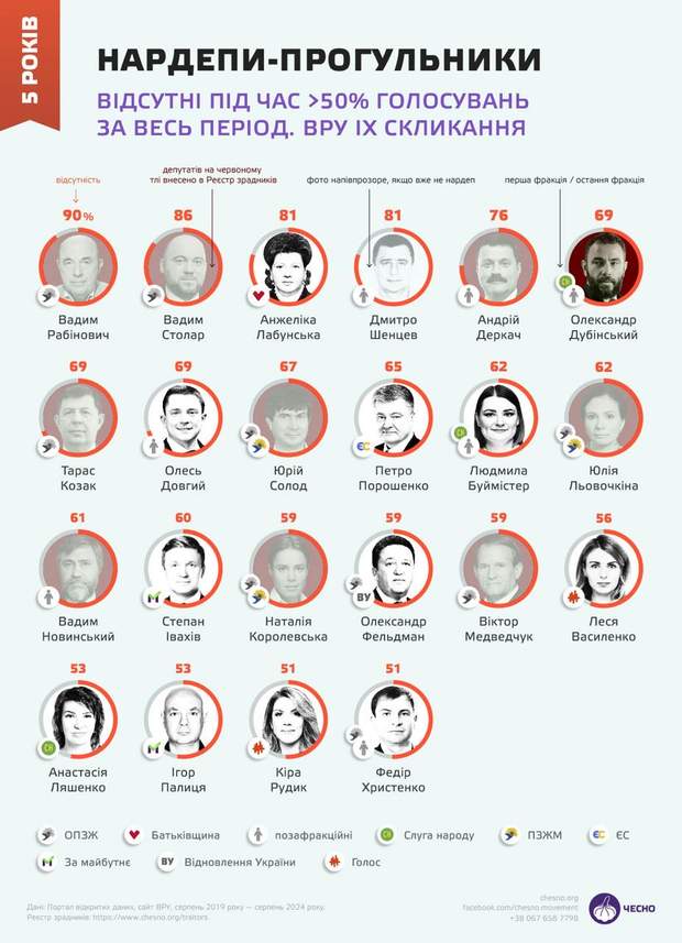 Аналитики "ЧЕСТНО" отмечают, что многие нардепы стали чаще пропускать заседания Рады именно после полномасштабного вторжения. Так, в антилидерах по прогулам те пророссийские нардепы, кто сбежал из Украины в первые месяцы полномасштабного вторжения. Большинство в конце были лишены мандатов или добровольно написали заявление об отказе от депутатства.