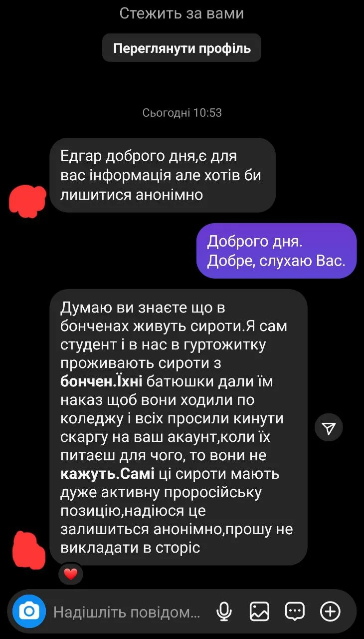 Угрозы Эдгару начали поступать в тот же день. Сначала мужчина не обращал внимания на сообщения в инстаграмме и блокировал адресантов. В то же время впоследствии начались звонки. Сначала неизвестные просто спросили, зачем он опубликовал историю с поддержкой СБУ. Впоследствии перешли к угрозам.