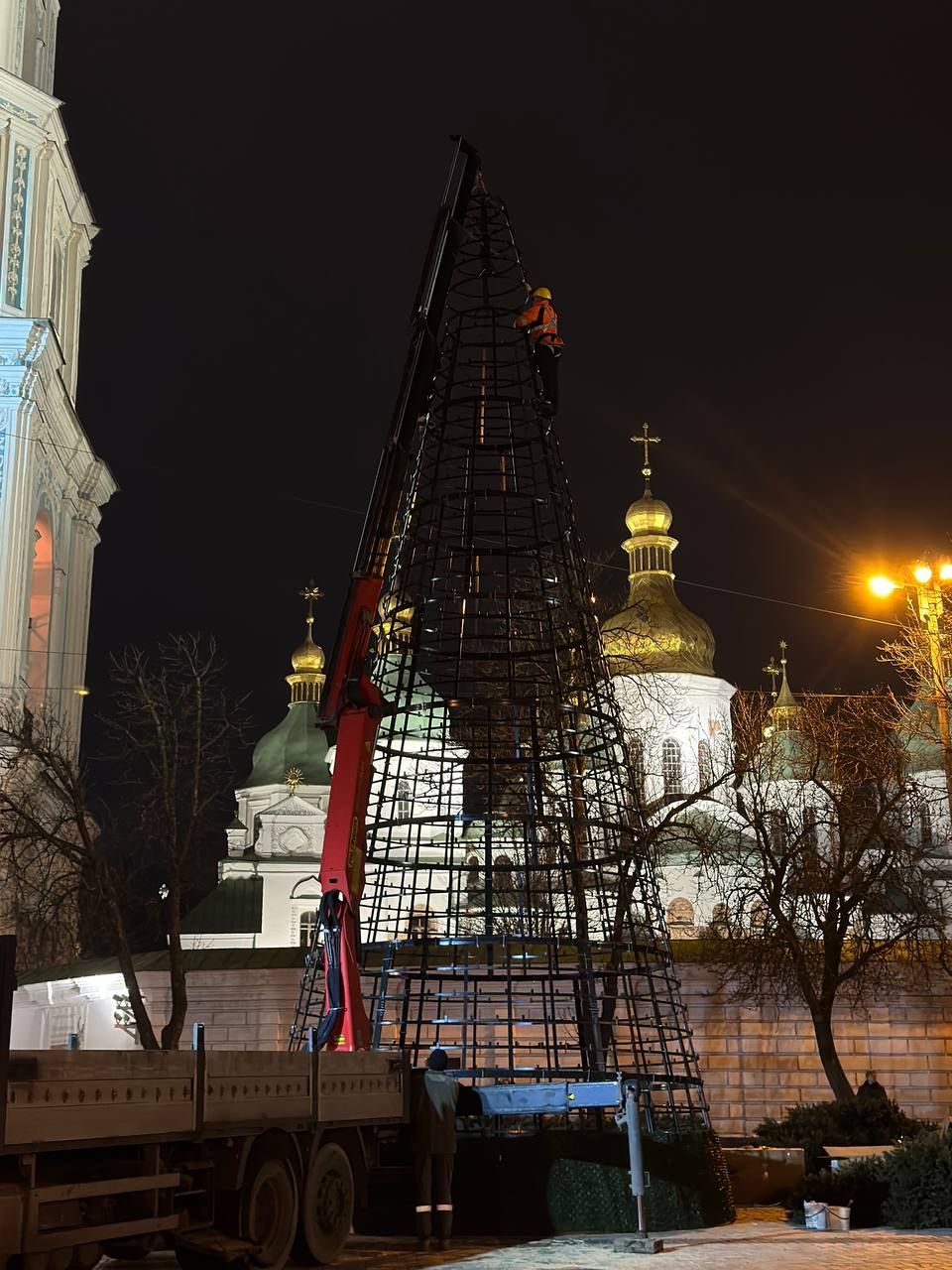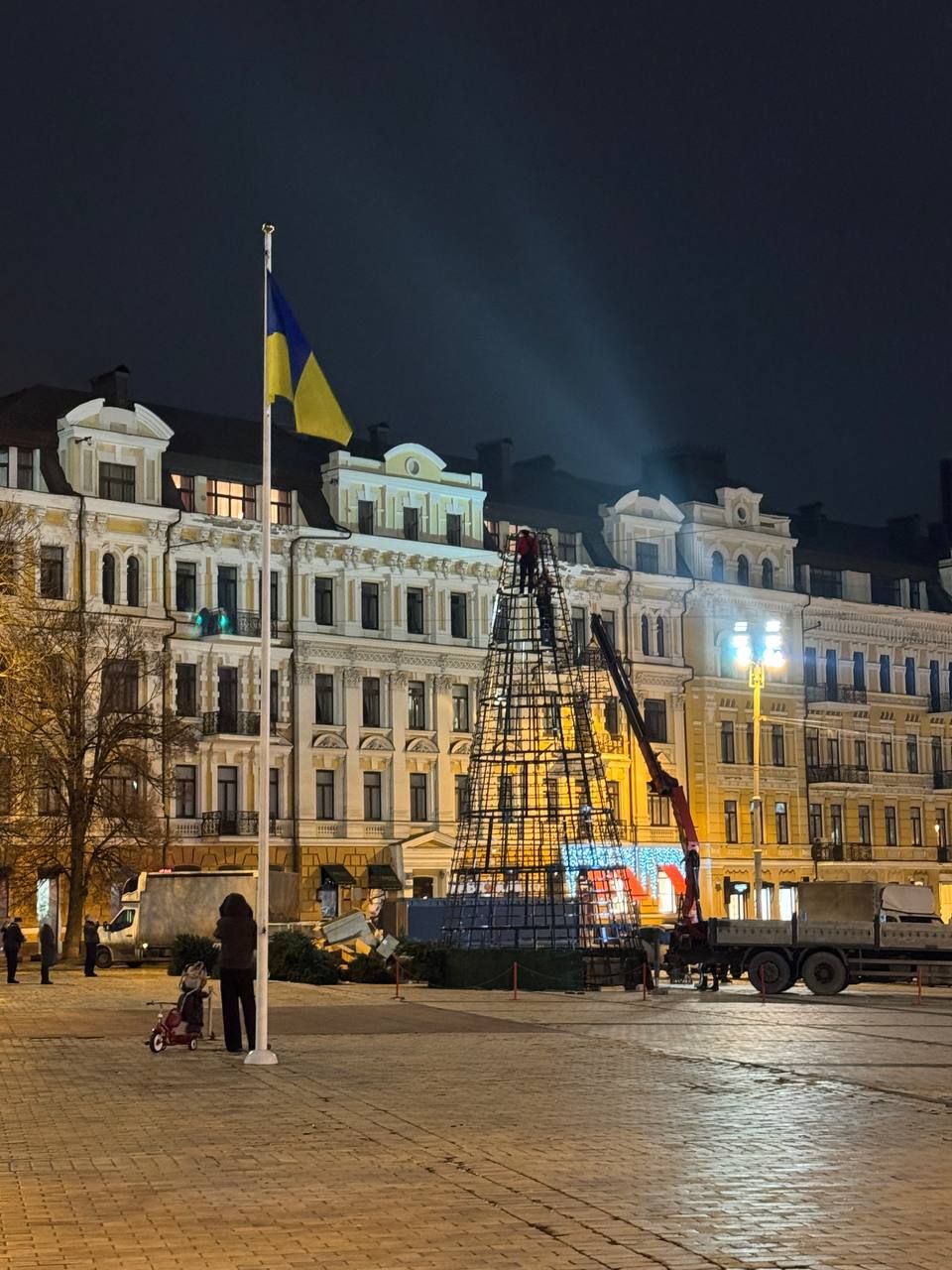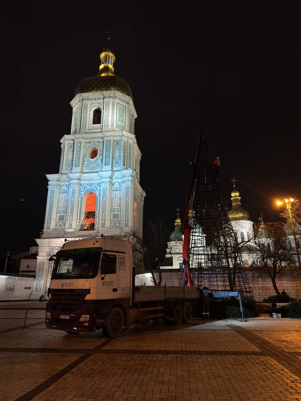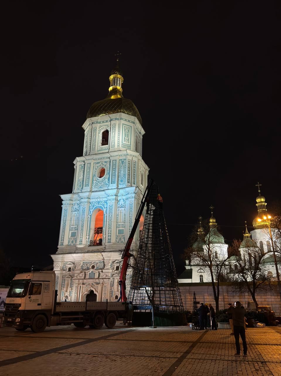 Жители Киева 27 ноября заметили, что на Софийской площади начали монтировать главную новогоднюю елку.