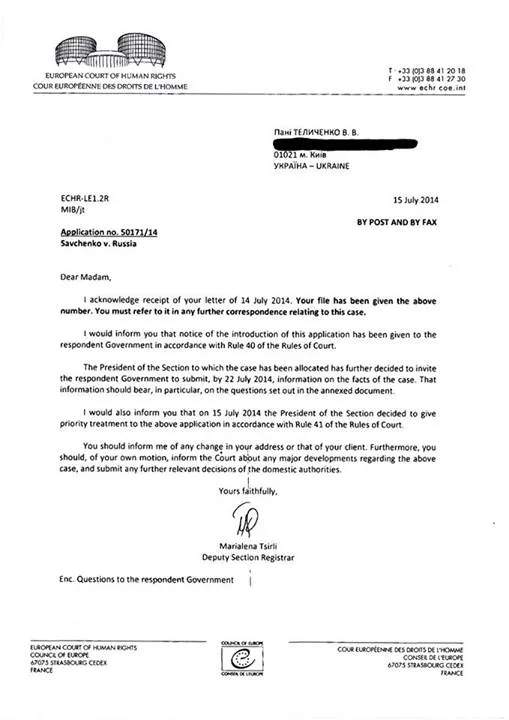 В письме говорится, что суд обратился к правительству-ответчику с просьбой в течение недели, до 22 июля, подать информацию о фактах этого дела и ответы на вопросы Страсбургского суда.