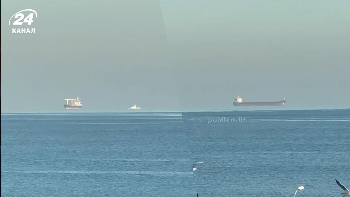 На видео, снятом в Одессе, видно несколько гражданских судов, которые входят в порт, или находятся на рейде, и кажется, будто они поднялись в воздух, оторвавшись от воды.